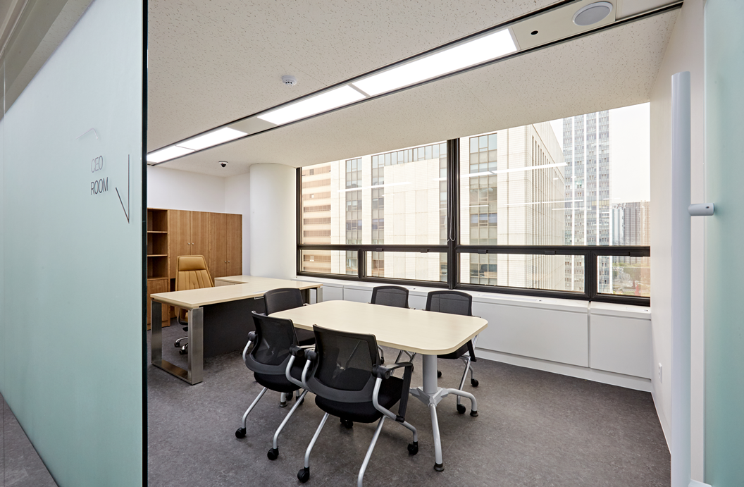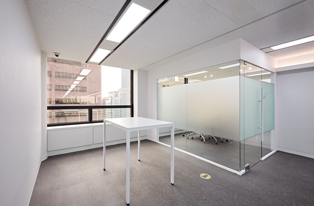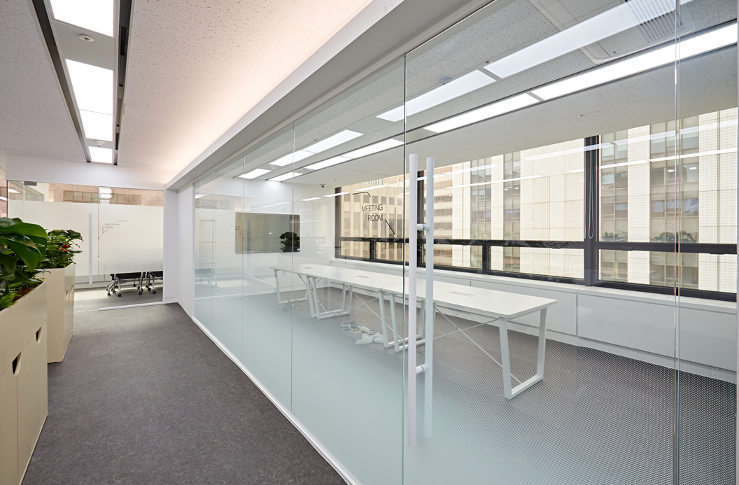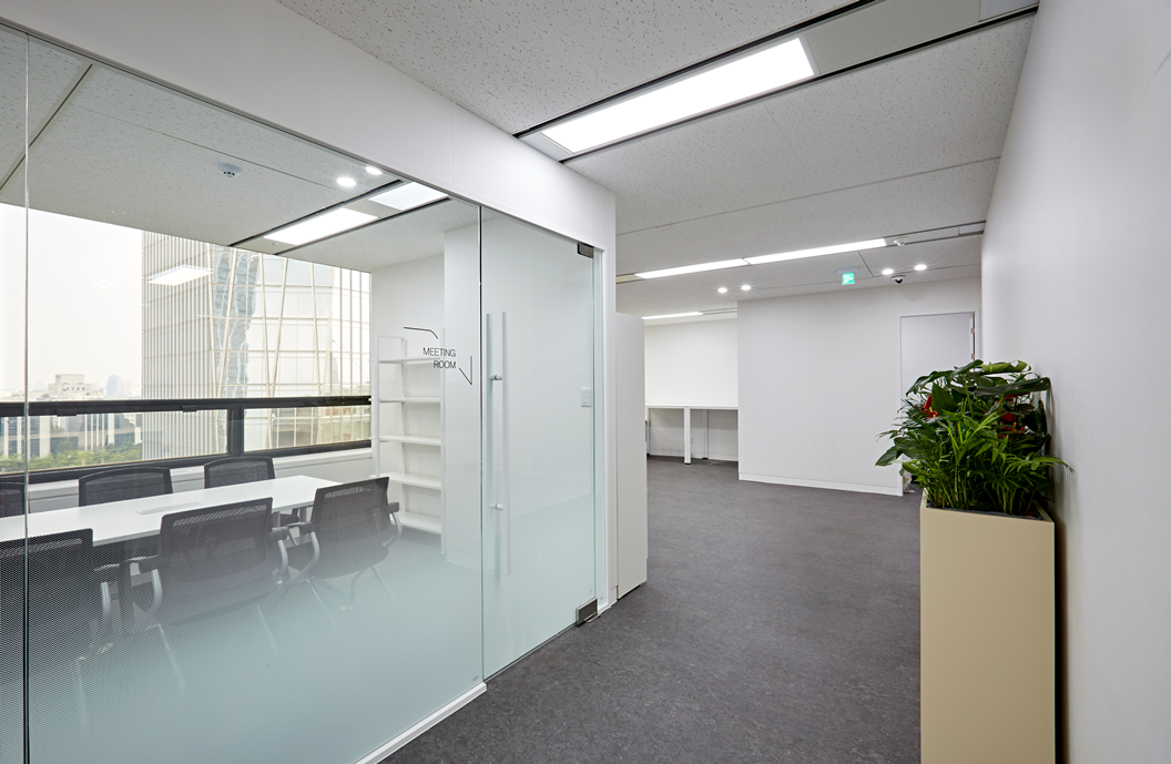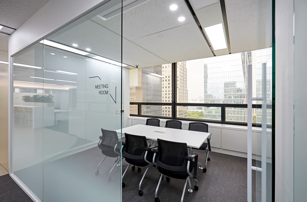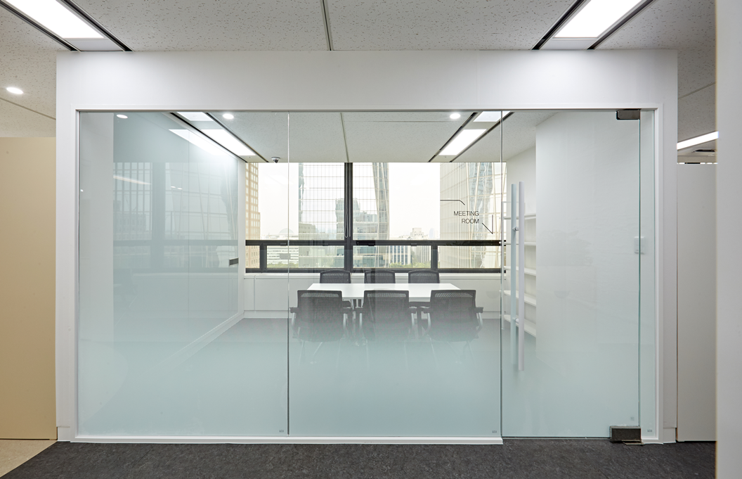 가장 일반적인 형태의 사무실에서는 유리가벽을 활용하여 업무 공간과 회의실, 휴게실 등을 구분할 수 있습니다.