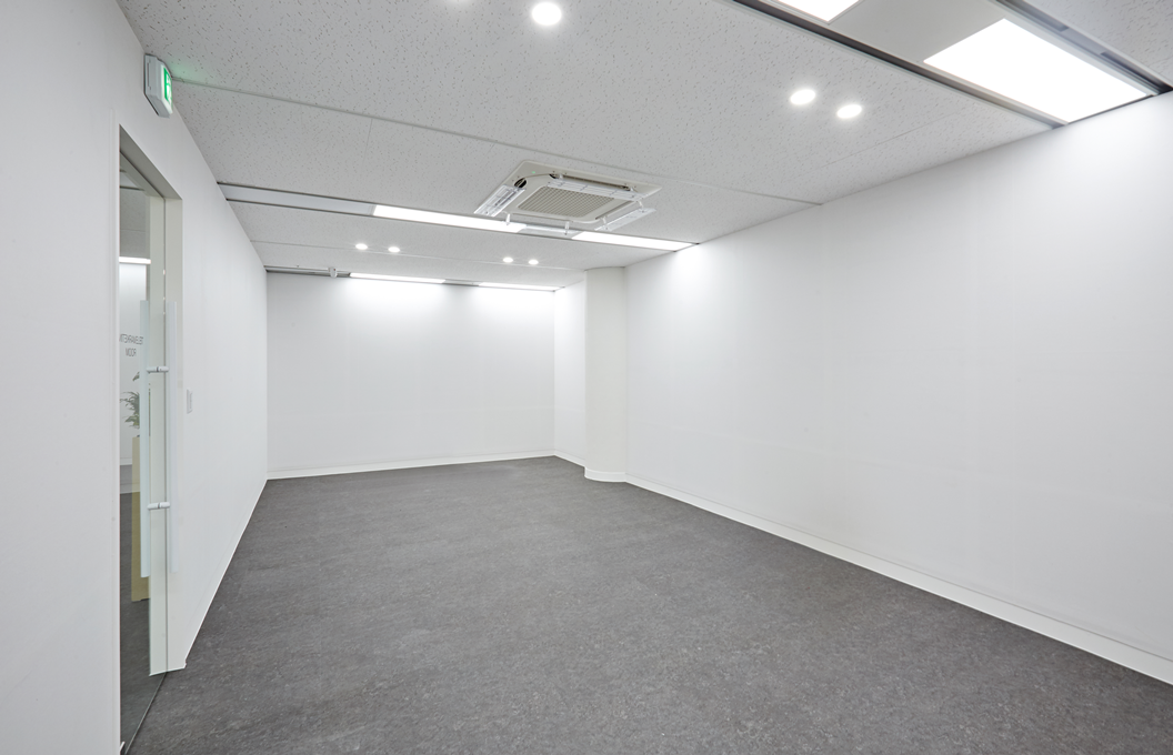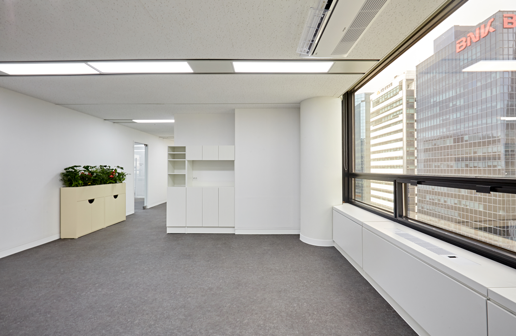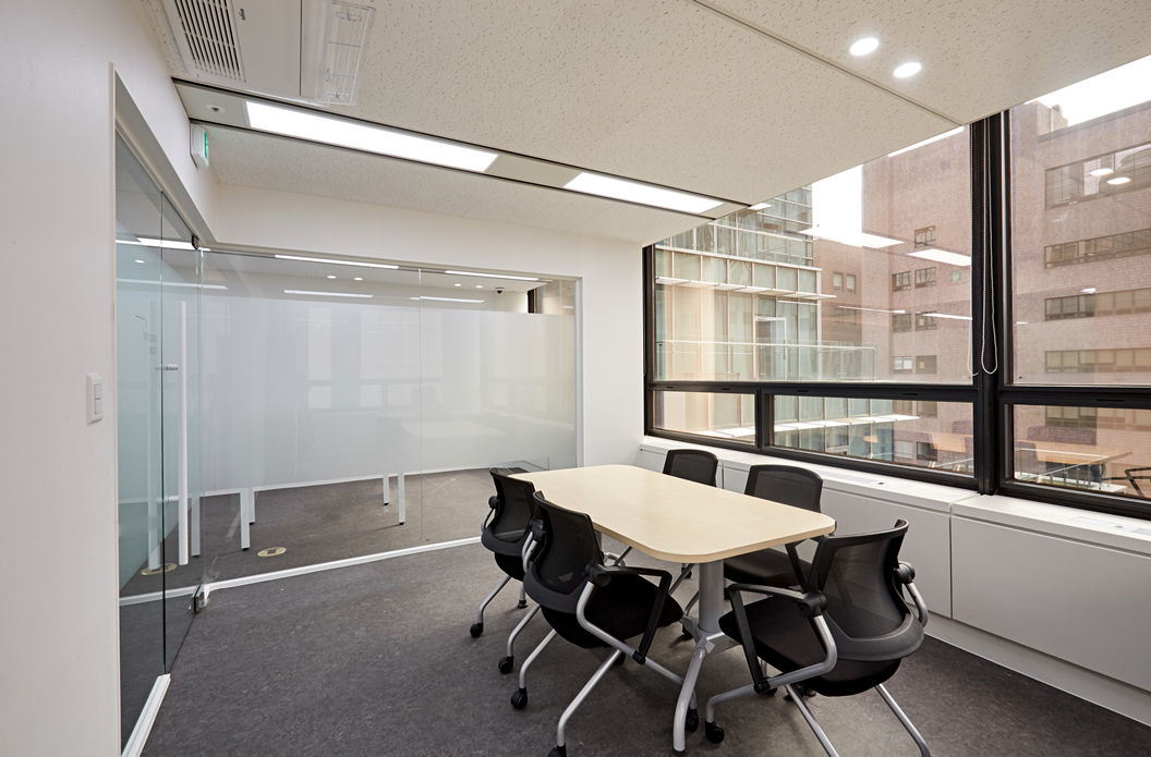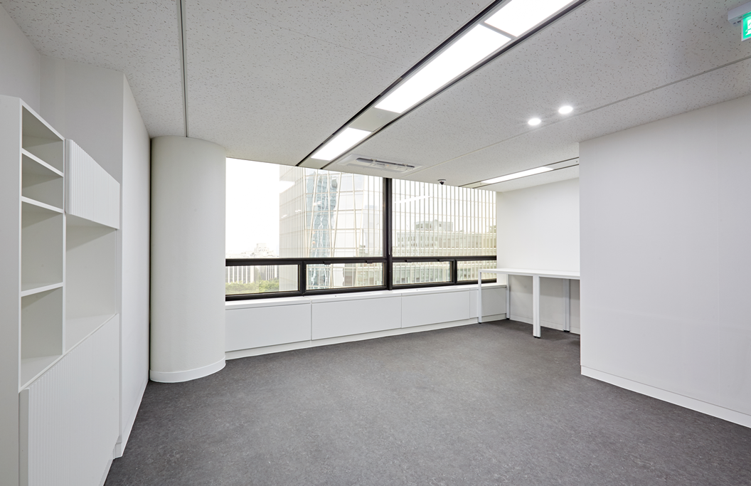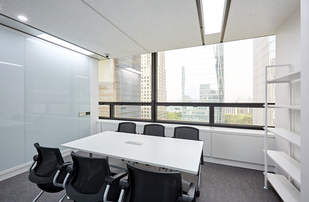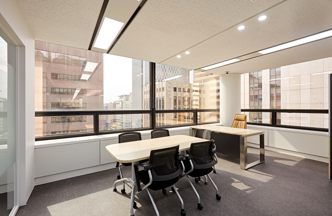 가장 일반적인 형태의 사무실에서는 유리가벽을 활용하여 업무 공간과 회의실, 휴게실 등을 구분할 수 있습니다.