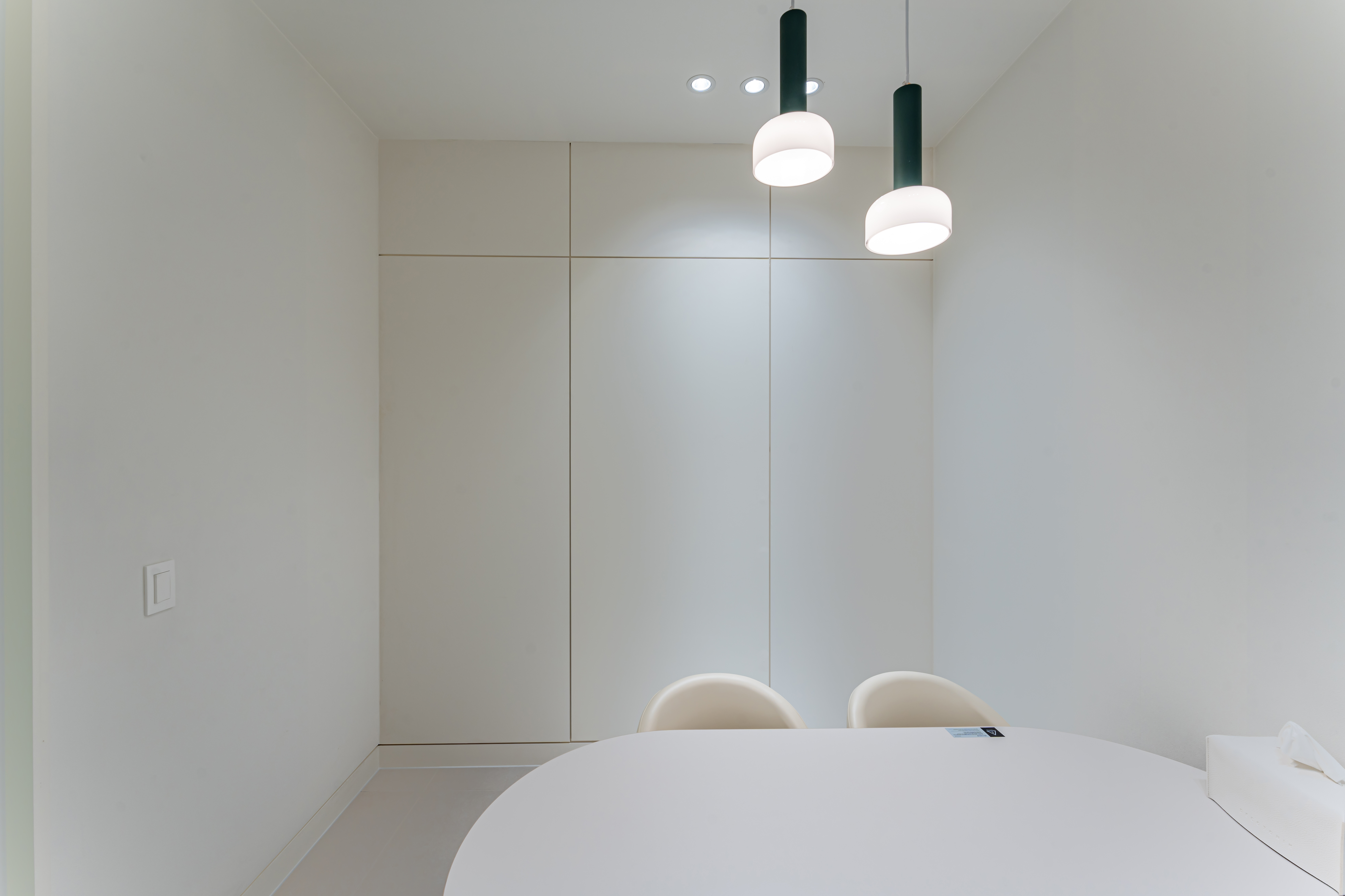 그리고 테이블, 의자, 벽, 바닥이 모두 하얀 공간은