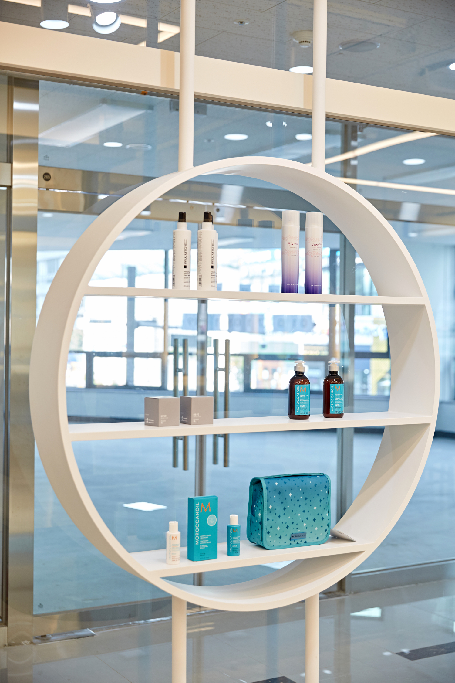 일산상가인테리어 30평 미용실의 점판대입니다. 마치 에스테틱에 온것 같은 느낌을 주는 고급스러운 연출을 위해 원형 프레임 선반을 활용하였습니다. 실용적으로 제품을 배치하면서도 디자인적으로도 훌륭해서 의뢰인분께서 매우 마음에 들어하신 디자인이기도 합니다.
