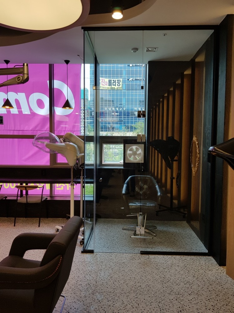 독립된 부스로 마련된 개별 공간으로 프라이빗하게 시술을 받으려는 고객을 위한 특별한 공간을 마련해 주었습니다. 답답한 느낌이 없게 개방감이 느껴지는 유리 부스로 설치하였으며 거기에 브론즈 유리를 더하여 고급스럽게 마무리하였습니다.
