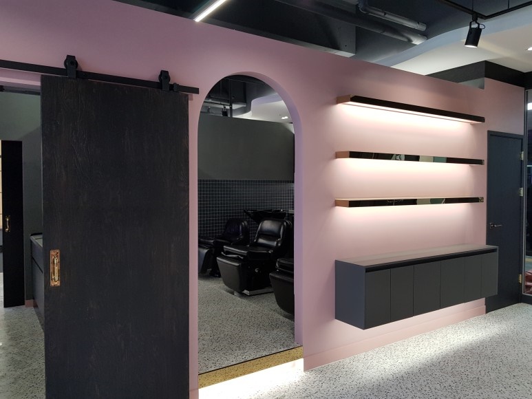 반대편 시술 공간의 경우도 역시 동일한 디자인으로 진행하여 통일감을 주었으며 이쪽 부분 벽면에는 아치형 모양의 입구를 보여주는 샴푸실이 위치하고 있으며 창고 공간이 마련되어 있습니다. 전체적으로 핑크 컬러와 블랙 컬러를 사용하여 독특한 매력을 보여주는 예쁜 멋진 미용실로 만나 보실 수 있으며 공간을 다양하게 활용할 수 있도록 실용적인 설계와 디자인 측면을 확인해 보실 수 있습니다.