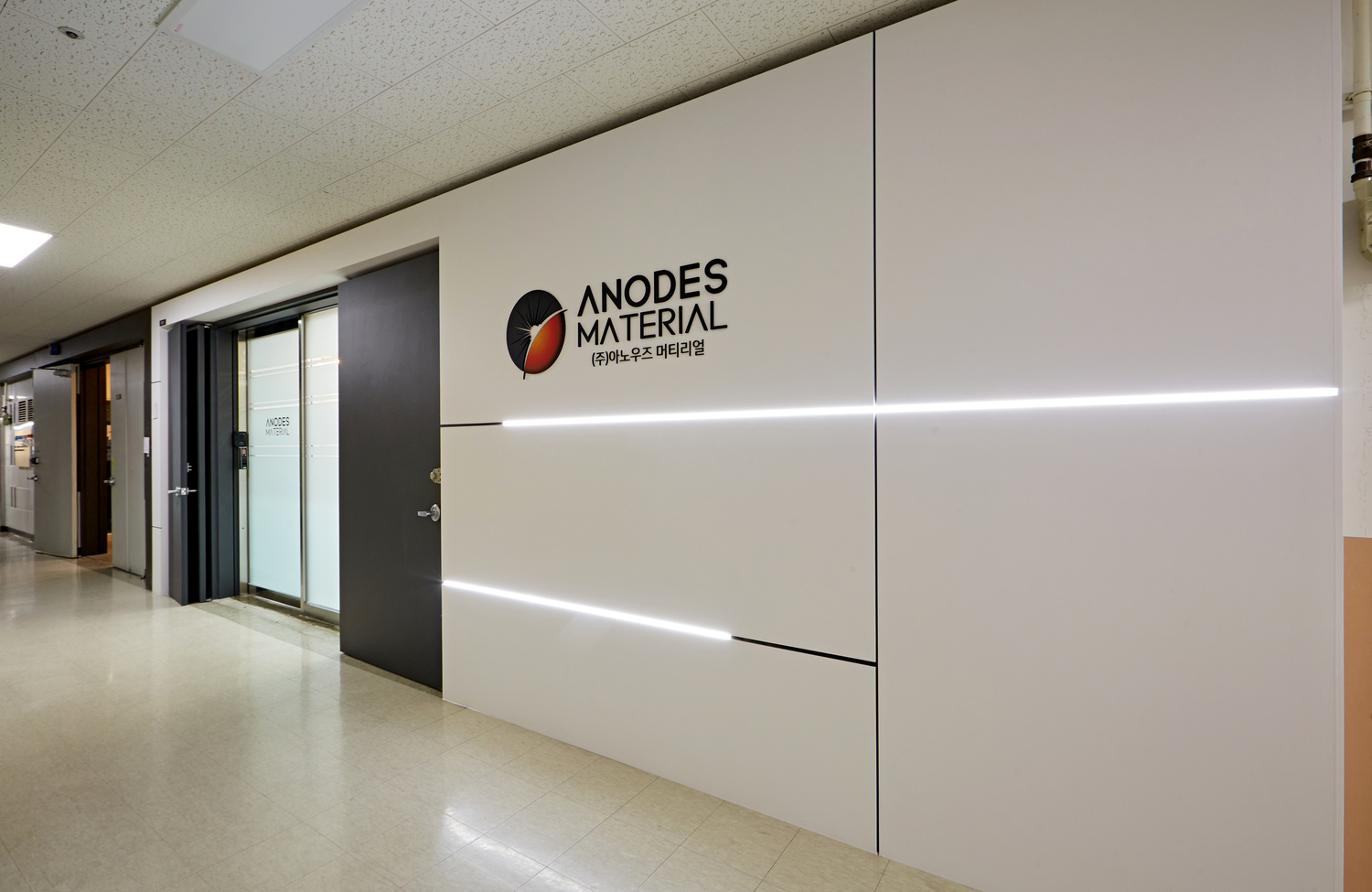 마지막으로 입구는 전체 화이트와 블랙으로 도장하여서 내부와 컨셉의 통일을 하였습니다. 그리고 라인 조명을 교차하여 시공하면서 색다른 포인트를 주었으며 로고를 양각으로 모던하게 연출하였는데요.