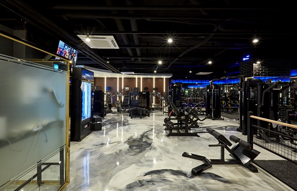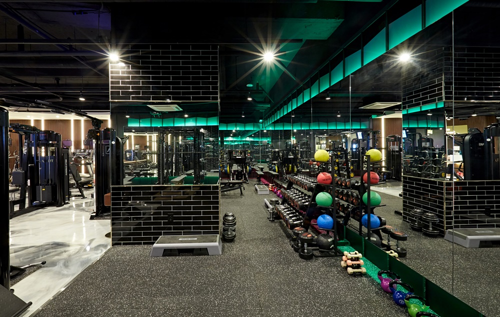 헬스는 동작이 크고 활동 반경이 넓으며 역동적인 운동이 많아 좀 더 집중할 수 있는 분위기로 만드는 것이 중요해 어두운 분위기에서 스팟 조명을 활용하도록 했습니다. 대신, 벽면을 따라 설치된 거울 윗부분에 색이 변하는 네온 조명을 넣어 활발하고 역동적인 분위기를 만들었으며 무게 운동 중심으로 이뤄지는 프이웨이팅존에는 바닥 매트를 깔아 소음과 충격을 흡수해 운동 효율과 효과를 높이도록 했습니다.
