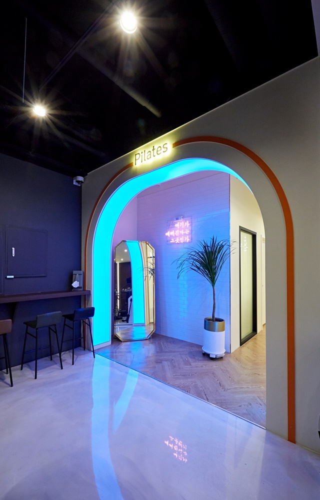 아치형 중문에는 헬스장의 네온 조명을 적용해 컬러가 바뀌도록 했고 문틀 위에는 [Pilates]와 [GYM] 사인물을 설치해 가독성을 높였습니다. 일산 부천 광명 필라테스 헬스장인테리어 추천!을 원하신다면 저희 916디자인으로 문의해 주세요.