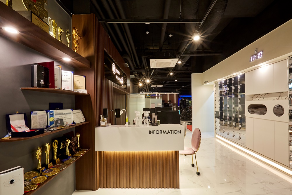 인포메이션 테이블 하단과 뒷벽면에는 우드톤의 템바보드를 적용해 따뜻하면서 아늑한 분위기를 연출했고 벽면 선반을 설치해 각종 수상 경력, 위촉, 표창 등을 진열함으로써 피트니스센터의 위상을 높일 수 있도록 했습니다. 피트니스센터 인테리어에서 상장, 트로피 등은 그 어떤 소품보다도 훌륭한 요소인데요, 이를 더욱 부각시키기 위해 무지주 선반을 시공하고 간접 조명을 설치해 돋보이도록 했습니다.