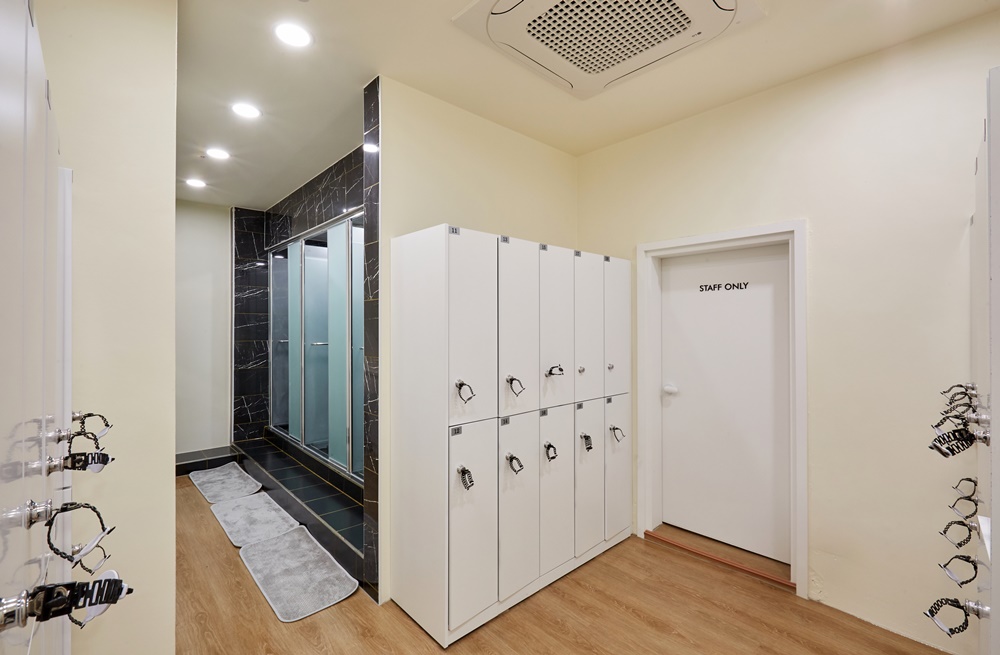 탈의실 & 샤워실은 회원들의 선택에 큰 영향을 미치는 시설 중 하나로 위생적이면서 쾌적한 느낌이 들어야 하므로 최대한 깔끔하게 화이트와 원목을 적용했습니다. 파우더 공간은 사이즈가 큰 거울을 부작하고 개별로 사용할 수 있도록 칸막이 시공을 했으며 웜톤의 조명을 시공해 더욱 화사하게 보이도록 배려했습니다.
