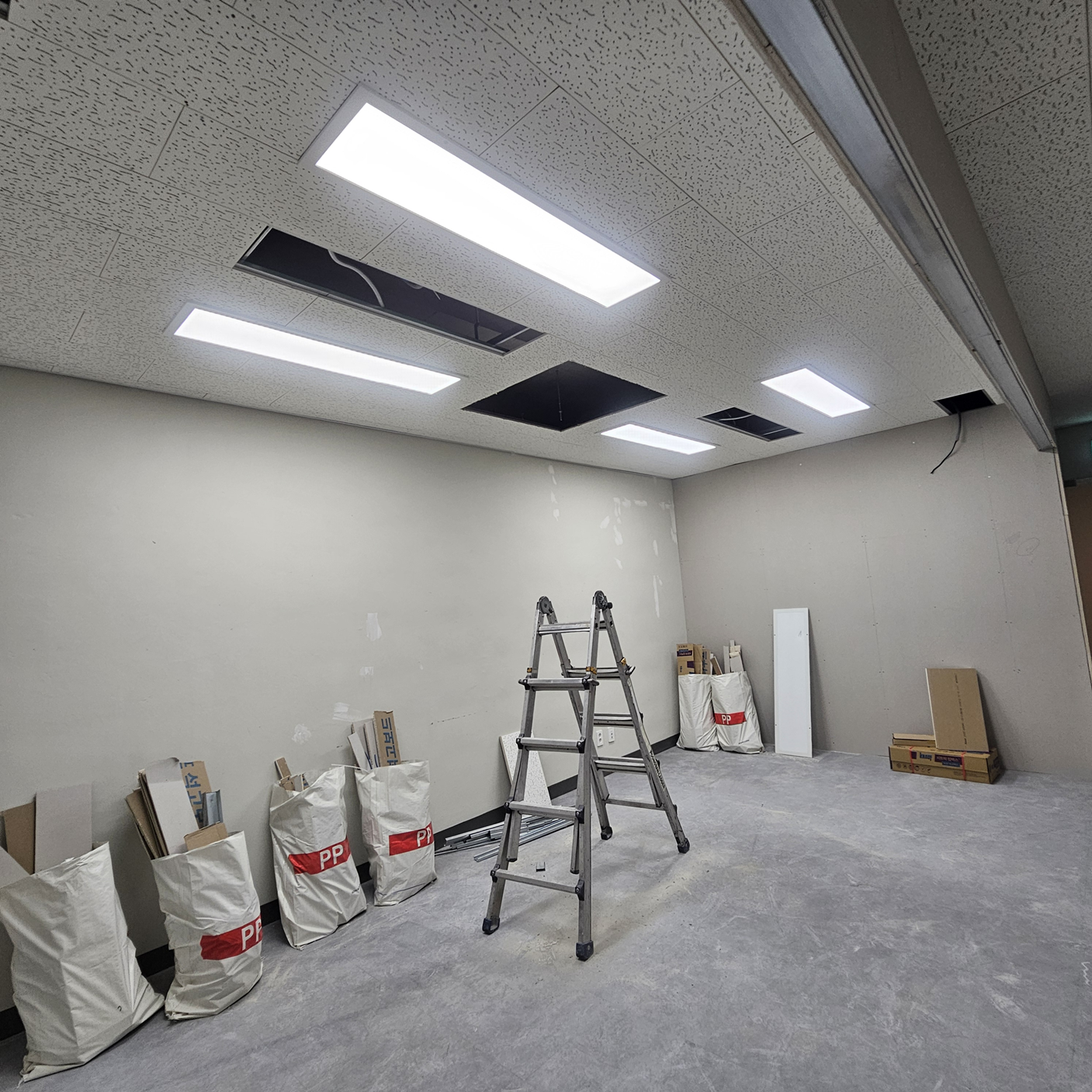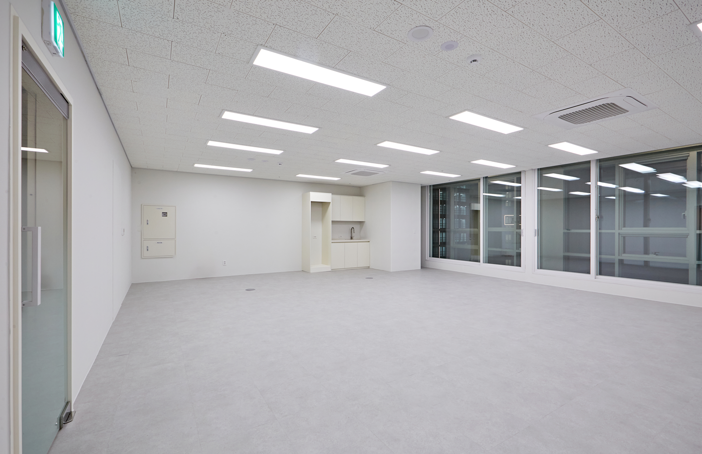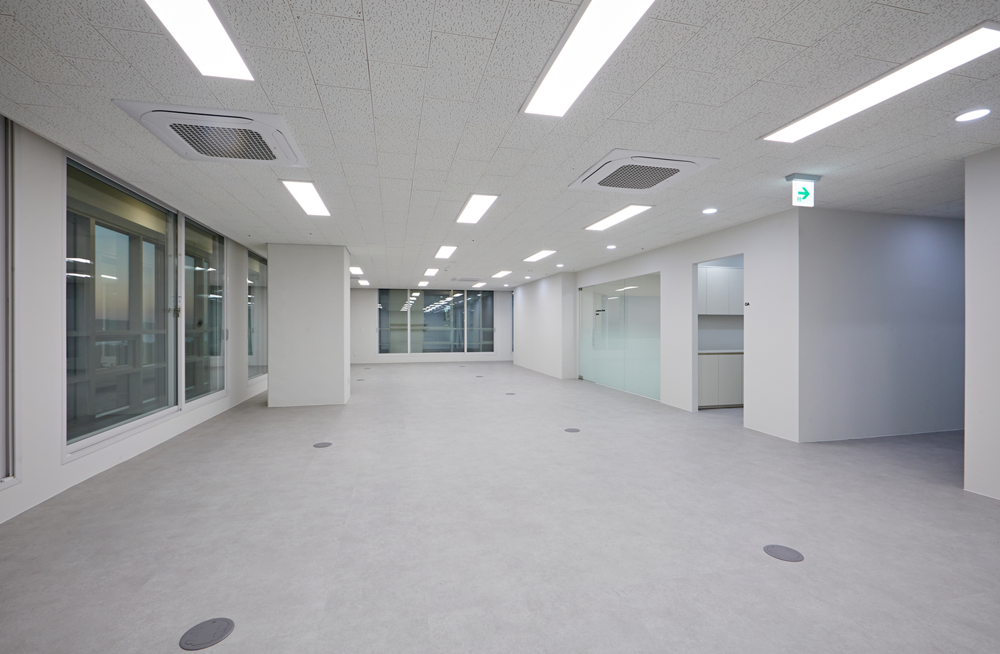 바닥에는 그레이 톤의 내구성 있는 바닥재를 시공하여 유지 보수 비용을 최소화하면서도 깔끔한 이미지를 유지했습니다.