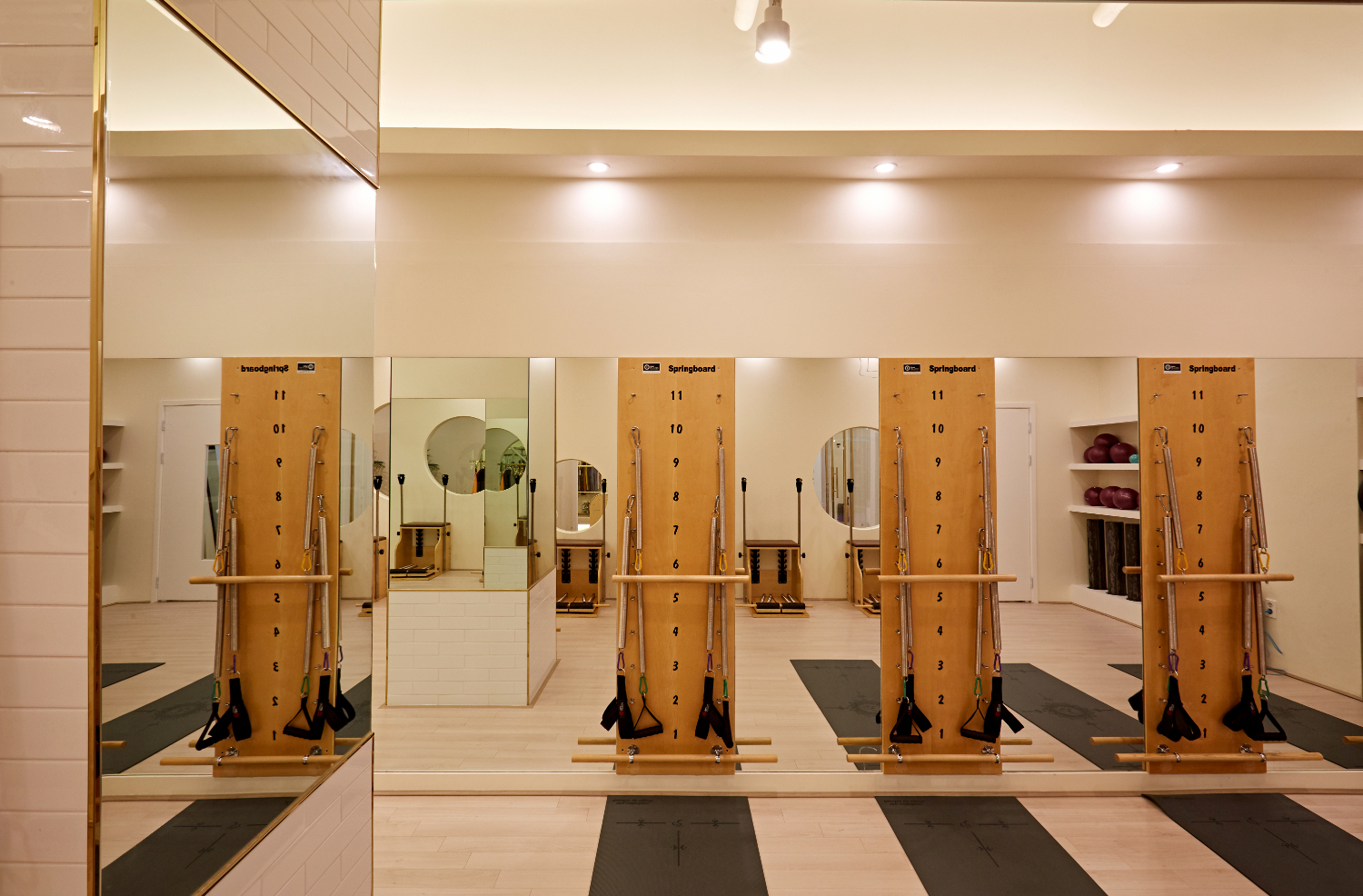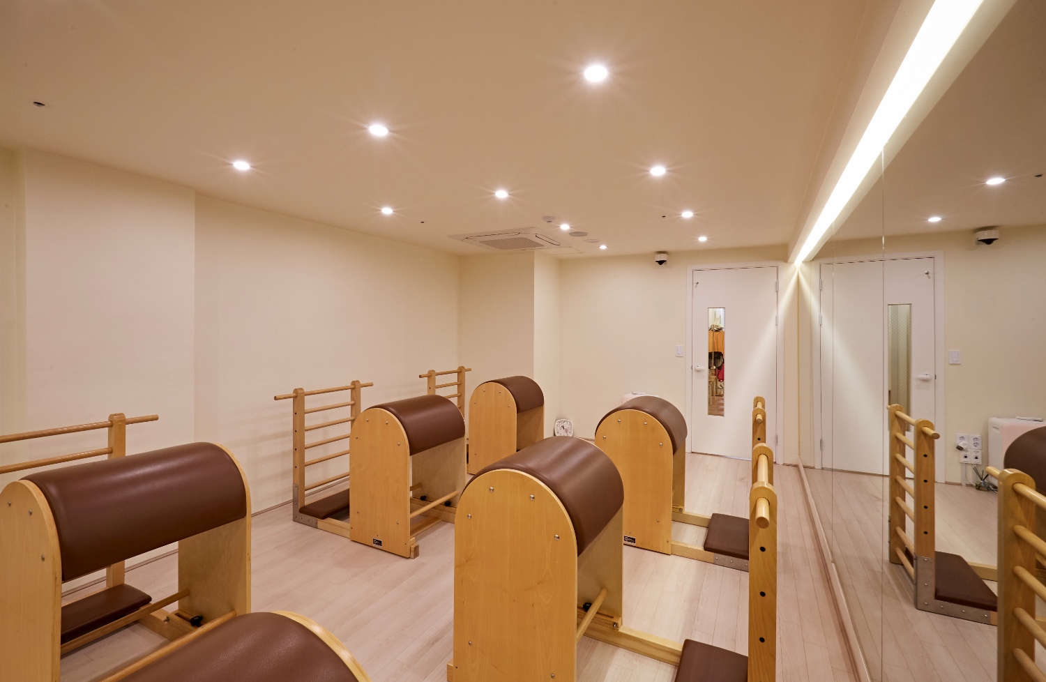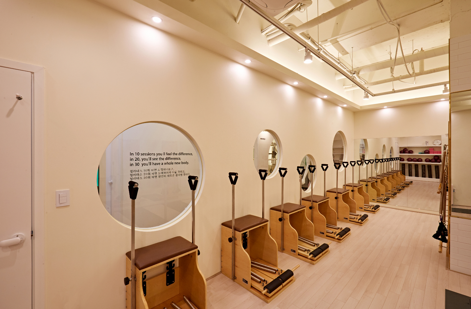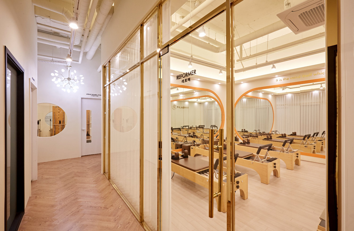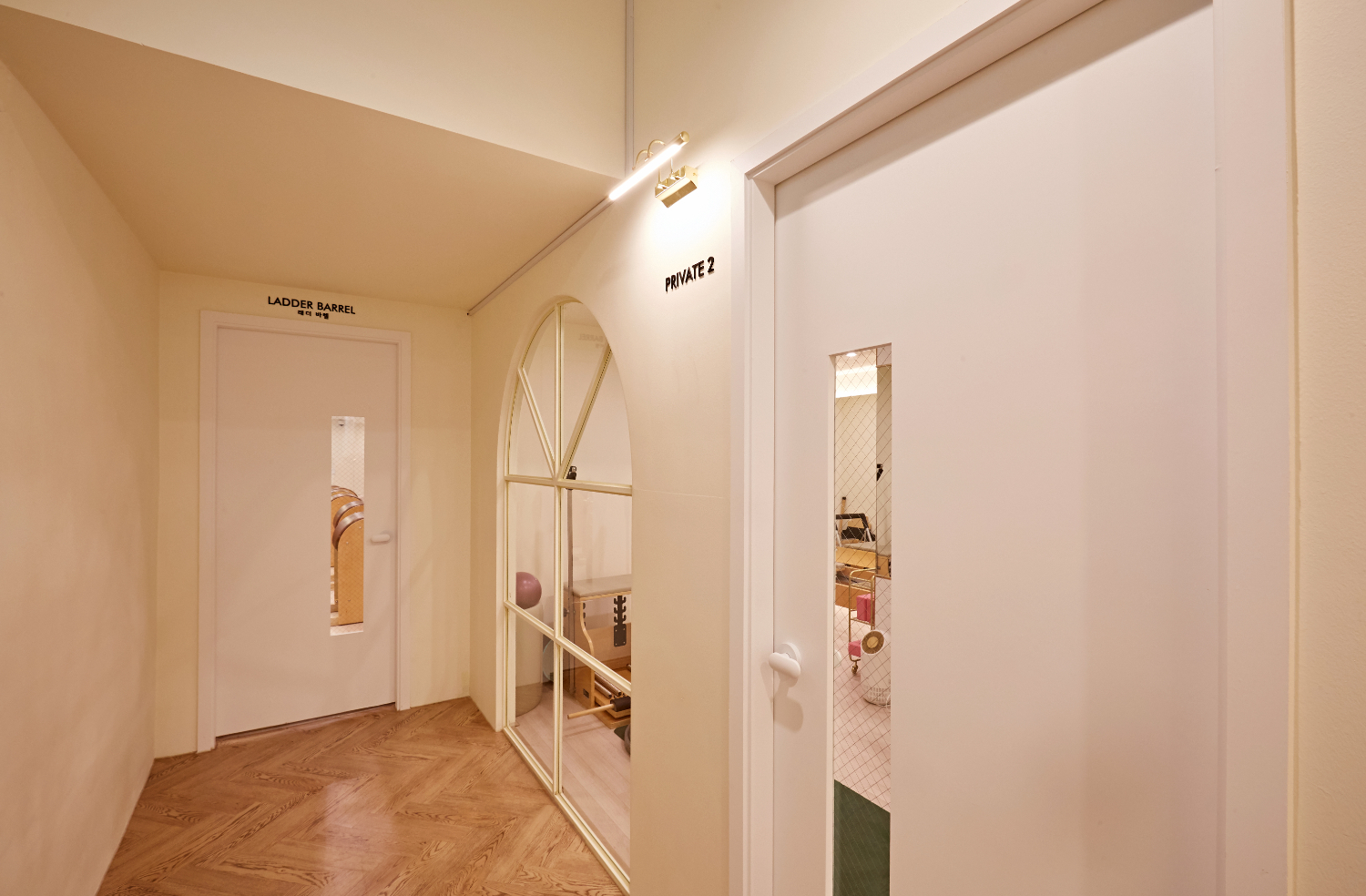 필라테스를 진행하는 공간은 잠실 석촌 뚝섬 피티샵인테리어에서 다른 차원의 세계라고 표현할 수 있는데요. 시끄럽고 활동적이며 현대적인 느낌이 나는 헬스장과는 다르게 차분하고 아늑한 분위기로 시공하였습니다. 그래서 천장은 화이트로 마감하였으며 바닥재는 헤링본 기법을 시공하였고, 곳곳에 원형 도어와 팬던트 조명이 설치되었는데요.