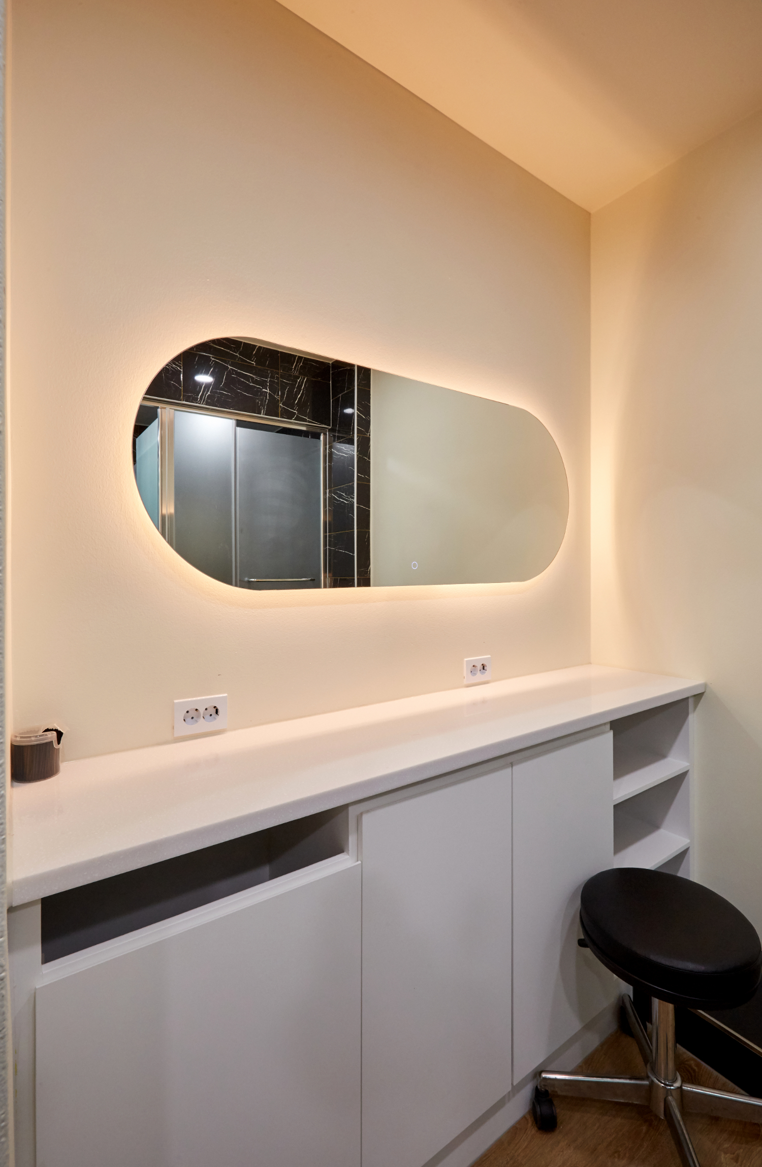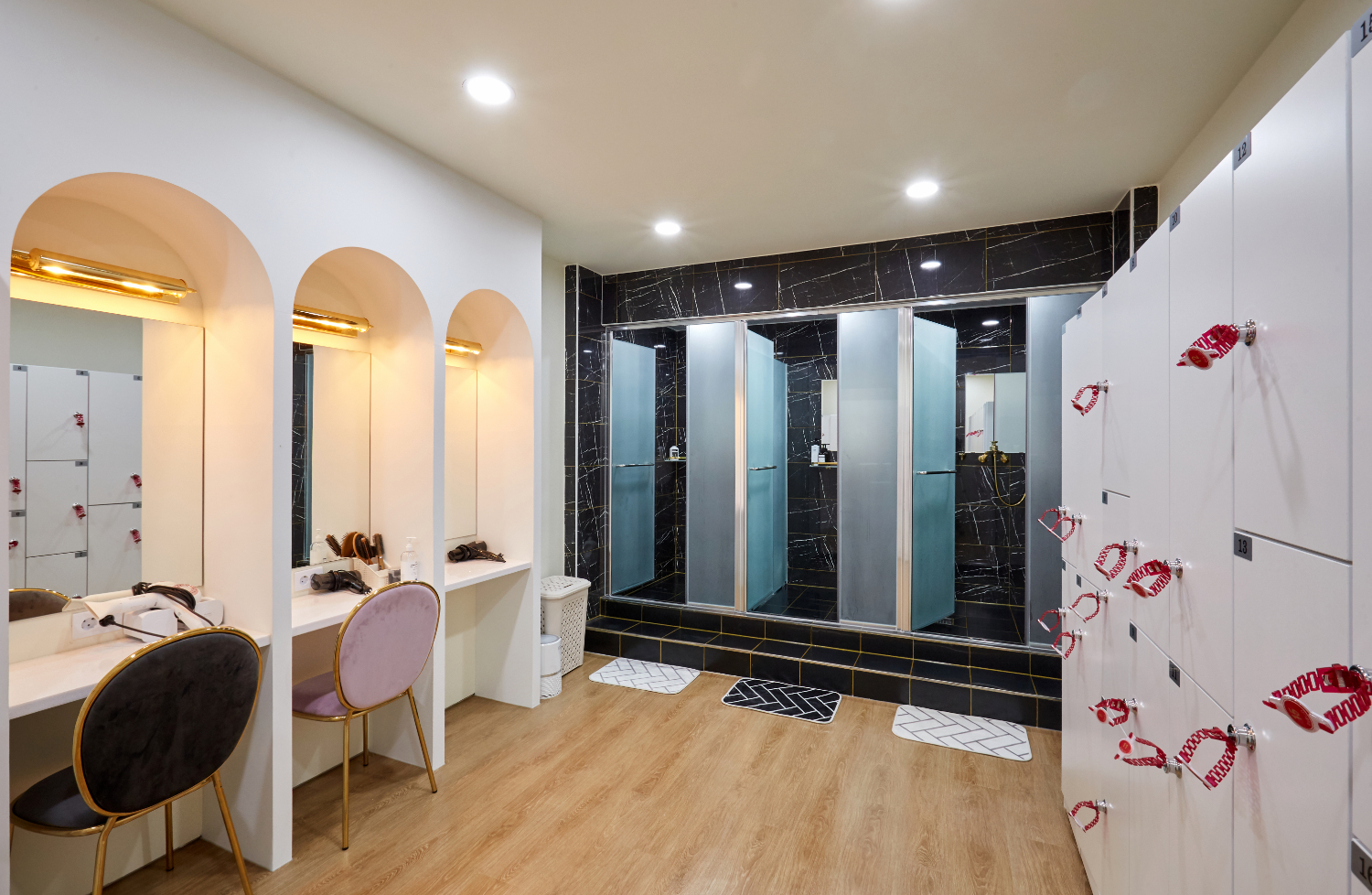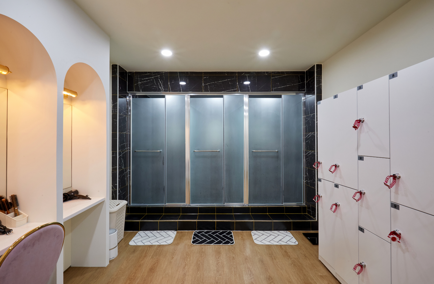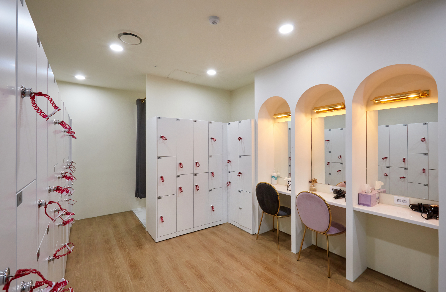 뒷편의 탈의실은 다른 피티샵과는 확실한 차별을 두었는데요. 우선 많은 고객들이 이용하실 수 있도록 캐비넷 수를 넉넉하게 설치하는것은 물론 아치형으로 된 화장대 3개를 배치하였습니다. 보통의 샵이라면 넓은 거울앞에 선반에서 여러 사람이 동시에 사용하지만, 이 곳에서는 프라이빗하고 고급스러운 느낌을 높이기 위해서 각자의 자리를 마련하였으며 거울 상단에 벽등도 매립하였습니다.