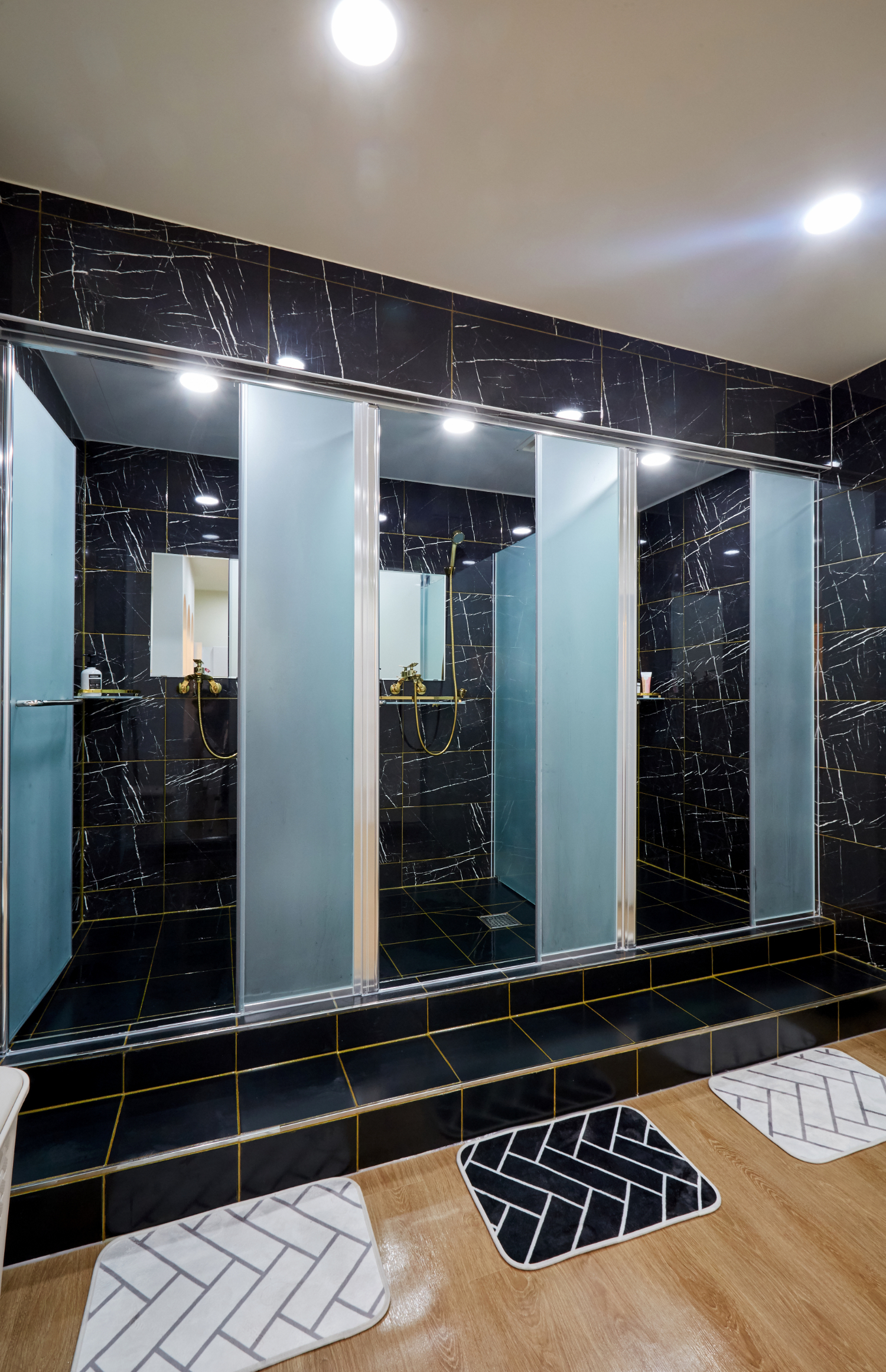 또한 샤워실은 블랙 대리석으로 시공하였는데요. 고급스럽게 보이면서 중후한 멋을 더해주는것은 물론 색상이 어둡기 때문에 오염에 강하고 청소 관리가 용이하다는 장점이 있습니다. 각자 프라이버시를 위하여 유리는 불투명으로 시공하였으며 내부에는 선반을 설치하여서 각종 용품을 올려두고 편하게 사용하실 수 있도록 하였습니다.