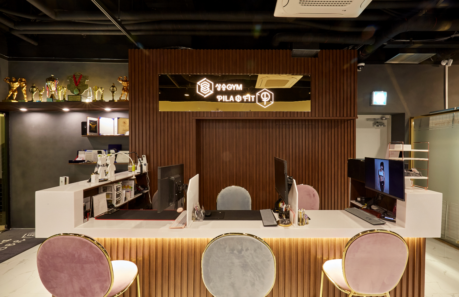 처음 들어서면 보이는 것은 카운터와 사물함입니다. 카운터 옆에는 우드 선반으로 된 곳에 여러 트로피와 상장이 진열되어 있으며 카운터는 우드 템바보드 시공으로 만들어졌는데요. 그리고 화이트 대리석으로 상판을 시공하였으며 하단에는 조며을 매립하여 조금 더 신비로운 분위기를 연출하였습니다. 그리고 화이트 인테리어의 장점은 바로 어떤 컬러와 조합하여도 어울린다는 것인데요. 의자는 핑크와 살짝 연한 그레이컬러로 조화를 맞추었습니다.