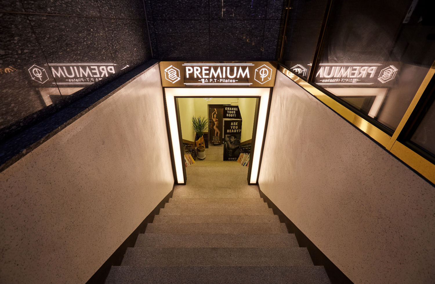 이번에 시공 한 잠실 석촌 뚝섬 피티샵인테리어현장은 대리석으로 지어진 건물의 지하에 위치하고 있었는데요. 그렇기에 사람들의 이목을 끌고 매장의 활성화를 위해서는 눈에 띄는 포인트가 있어야 한다고 생각했습니다. 그래서 입구에는 전구로 테두리를 전부 채운 입간판으로 사람들의 시선을 끌었고, 내부로 들어가는 곳에도 ㄷ자로 전체 조명을 설치하였습니다.