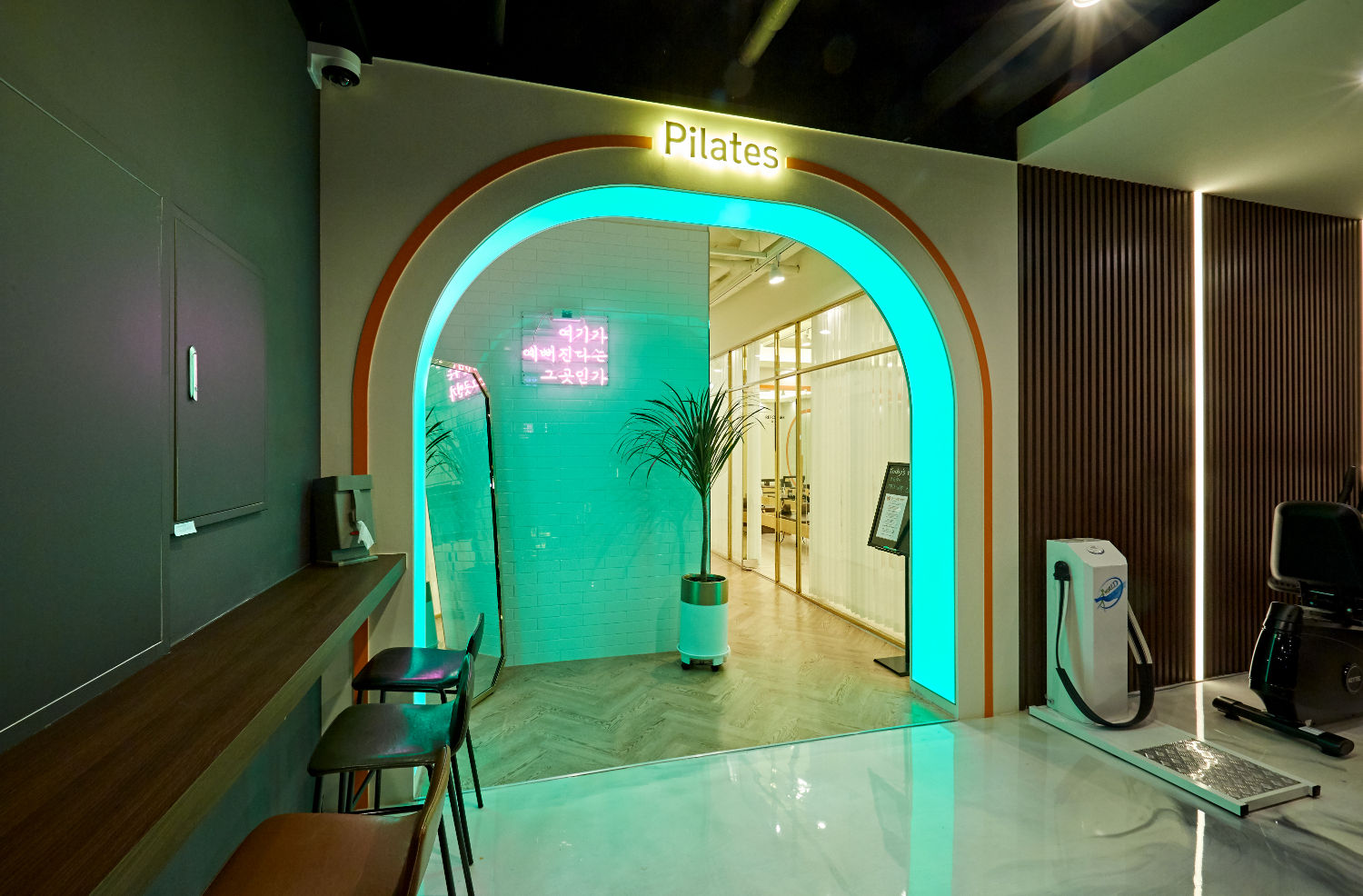 특히 필라테스로 들어가는 아치형 도어는 라인을 따라서 조명이 매립되어 있었는데요. 컬러풀한 색상 연출이 얼마든지 가능하여서 해당 배경음악이나 오늘의 날씨, 그리고 손님의 연령층이나 취향에 따라서 바꿀 수 있었습니다. 그리고 여기를 넘어가면 필라테스 공간으로 바뀌기 때문에 바닥재를 바꾸면서 공간의 분리를 확실시 하였습니다.