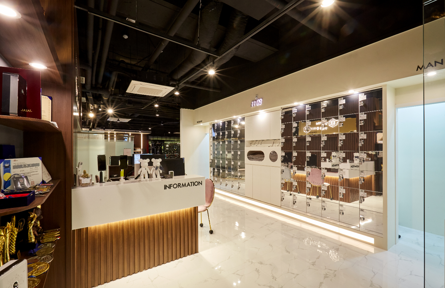 천장은 블랙 도장으로 노출 천장 시공을 감행하였으며 높은 천고는 잠실 석촌 뚝섬 피티샵인테리어의 필수라고 할만큼 많은 클라이언트분이 요청해주시고 있습니다. 그리고 우드 템바보드 위쪽에는 골드 컬러에 하얀 글씨로 로고를 새겨놓았으며, 자리마다 파티션을 낮게 세워 시야를 가리지 않으면서도 동시에 여러 고객과 상담할 수 있는 공간으로 연출하였는데요. 뒷편의 사물함은 편하게 짐을 보관할 수 있으며 최적의 동선이라고 생각하여 배치하였습니다.