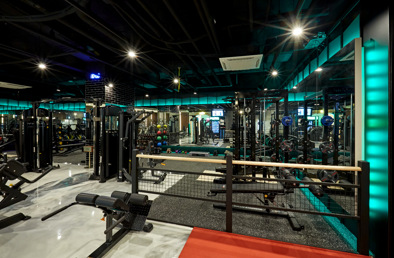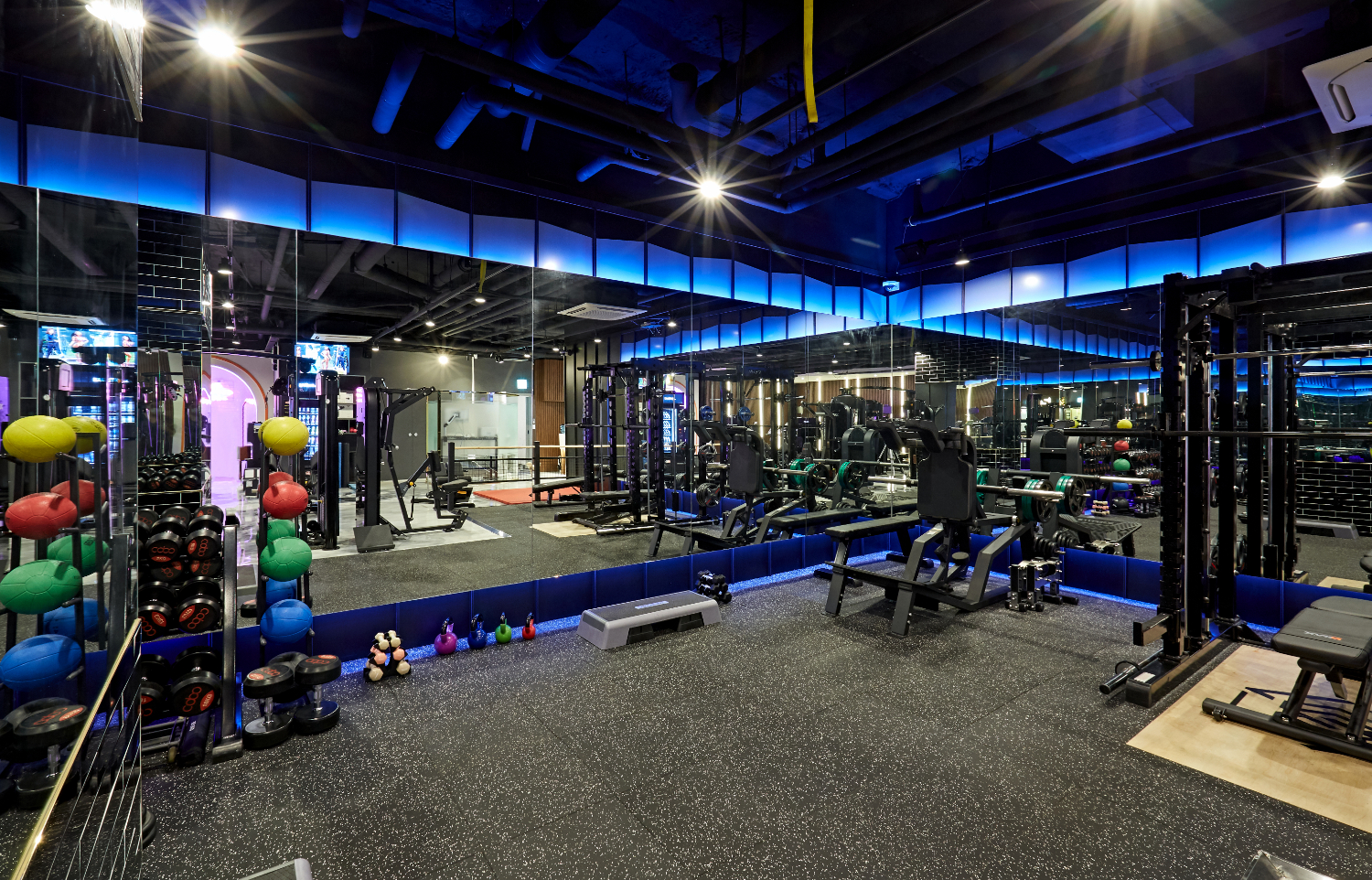 시시각각 조명의 컬러가 변화하기에 단조롭지 않고 질리지 않는 매력을 선사하고 있습니다. 그리고 곳곳에 거울을 배치하여서 공간이 더욱 넓어보이게 만드는 것은 물론, 트레이너들이 어디에서도 여러분을 지켜보고 있다는 마음에 운동을 더욱 열심히할 수 있는데요.
