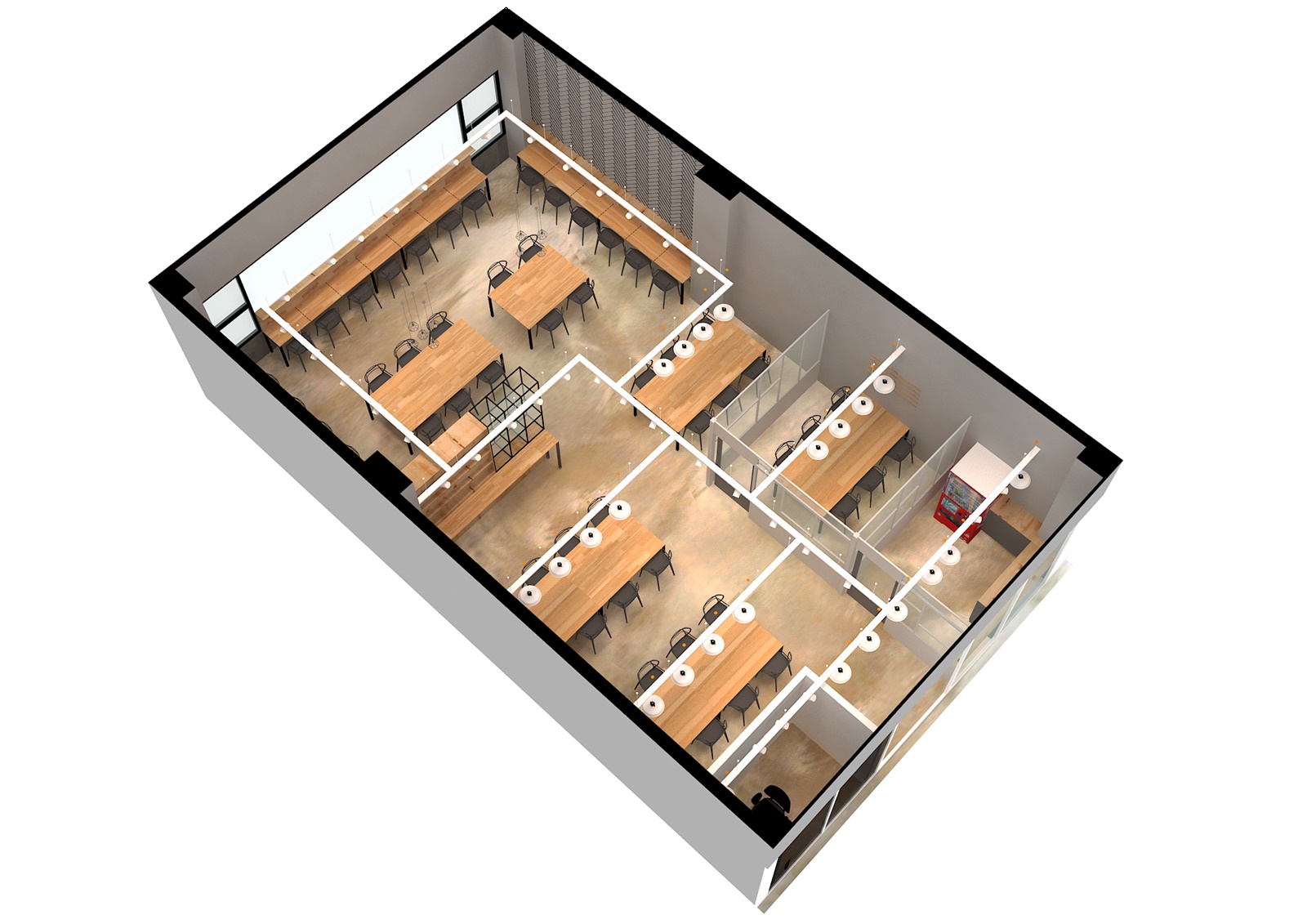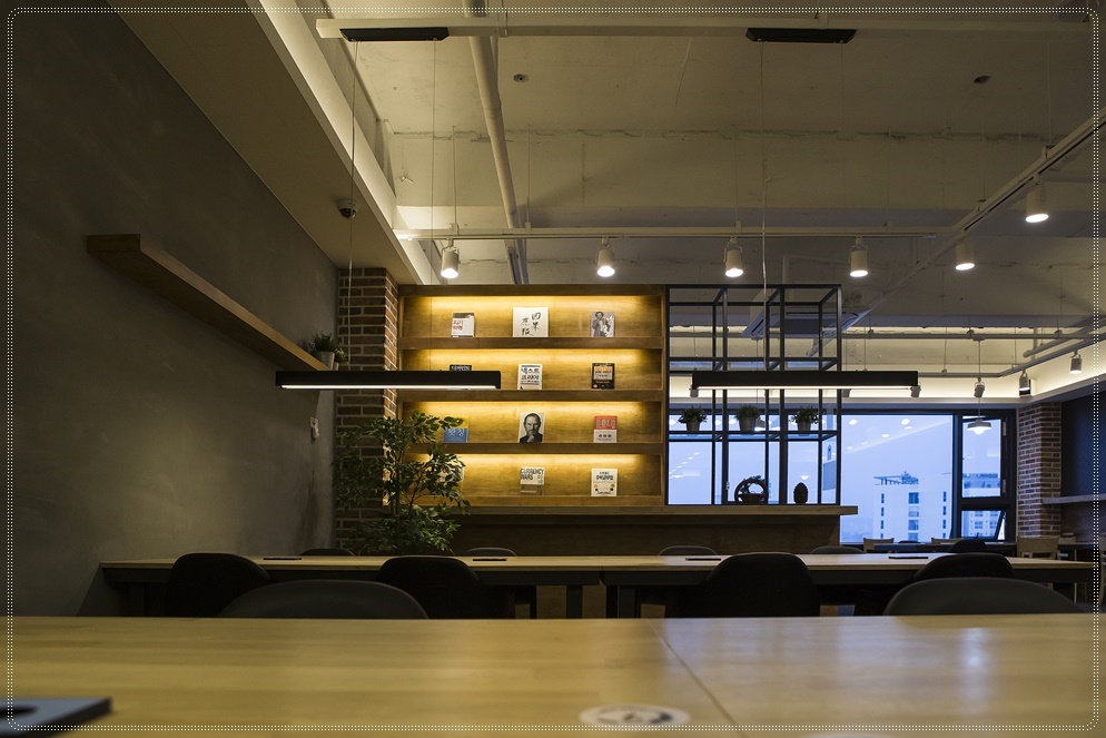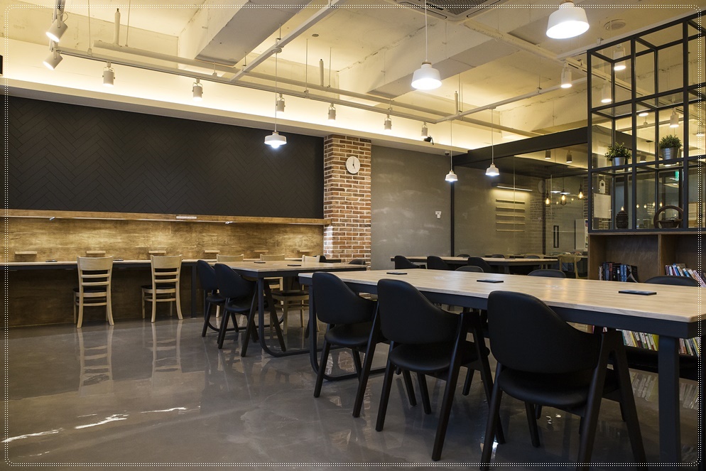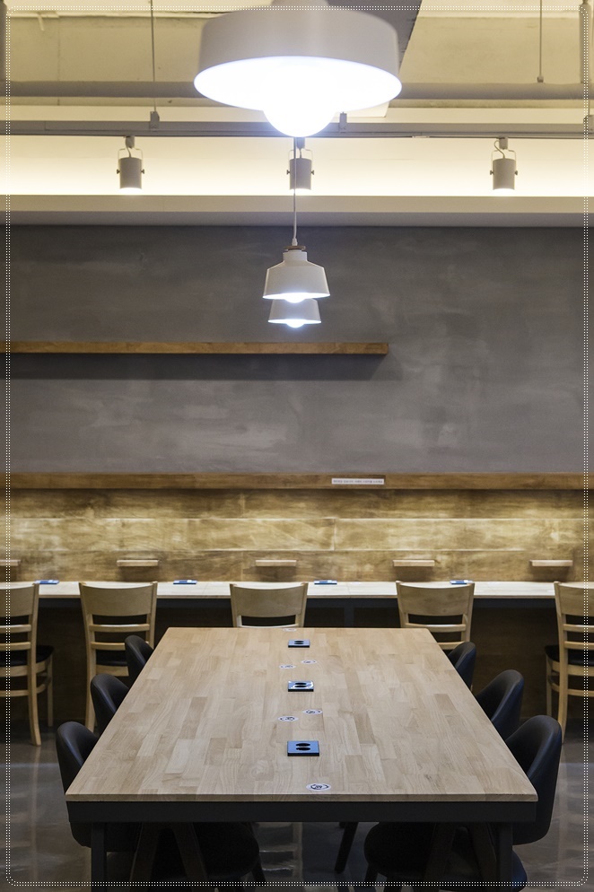 노출천장은 자체만으로도 인테리어 효과가 있는데 여기에 레일형 조명과 몇 가지 빈티지한 요소를 더했더니 더욱 멋스러운 공간으로 완성되었습니다. 공간을 블록별로 나눠 파벽돌, 콘크리트, 우드, 창문 등을 포인트 요소로 활용함으로써 각각의 다른 분위기를 연출해 원하는 공간을 선택할 수 있도록 했습니다.