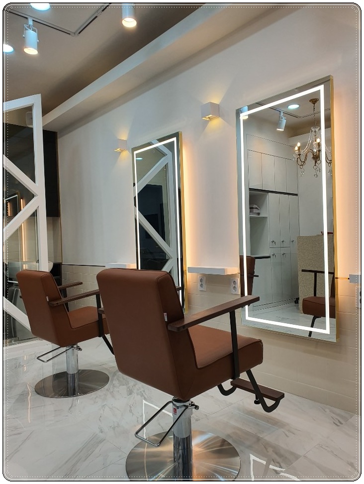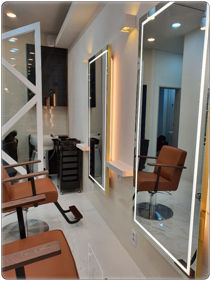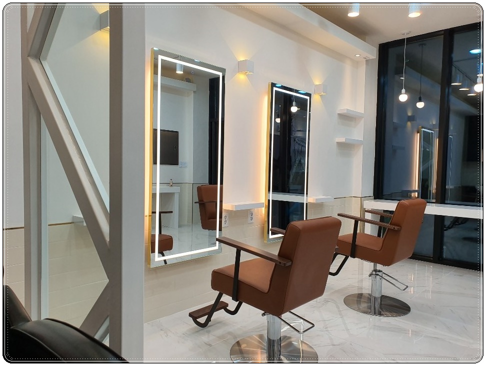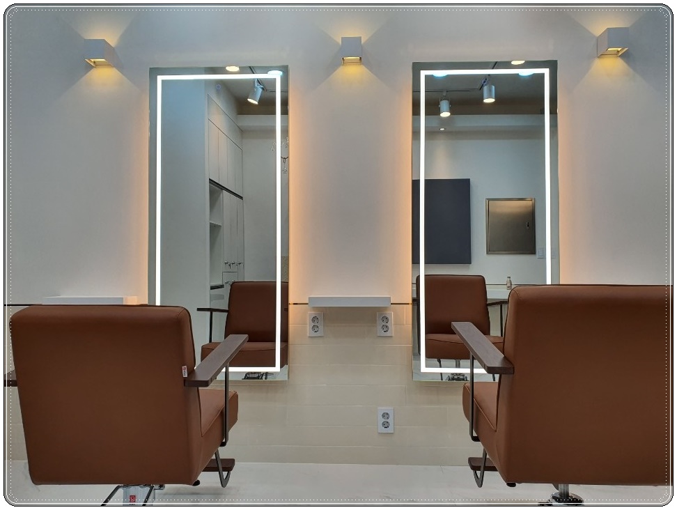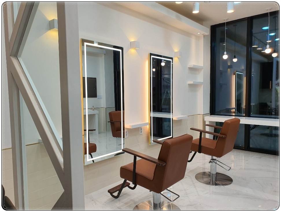 잠실 여의도 운정 미용실인테리어, 클래식 모던한 스타일 연출 및 공사비 만족스럽게 진행한 이번 현장의 경우 거울에 간접조명 라인을 둘러 더욱더 화사하고 세련된 모습을 보여 주고 있습니다.