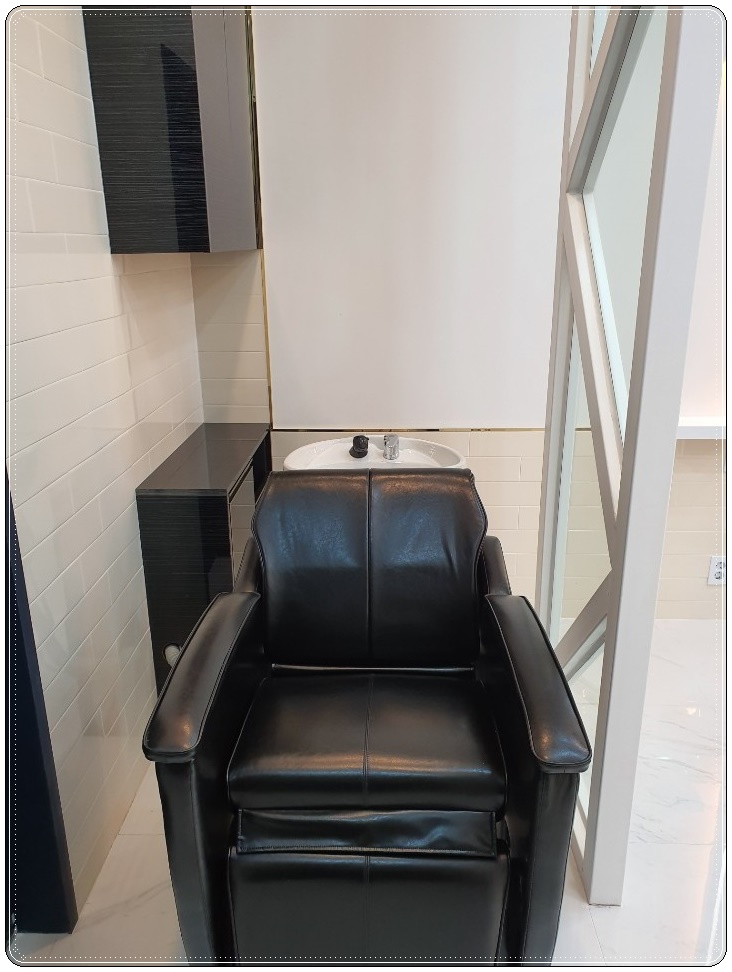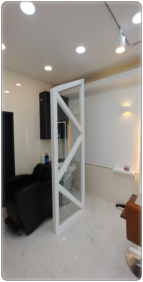 시술을 받을 공간 옆쪽에는 투명 유리에 삼각형 모양의 파티션이 설치되어 있으며 샴푸실과 공간 분리가 된 모습 확인해 보실 수 있습니다. 공간 분리가 확실하게 되면서 답답해 보이지 않도록 하고 있어 작은 소형 평수의 매장에 잘 맞는 인테리어입니다.