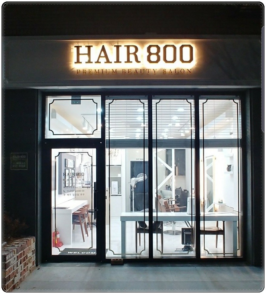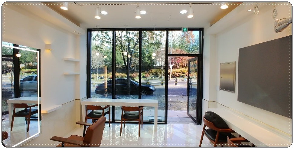 통유리에 블랙 프레임을 더하여 입구 공간을 완성해 드렸습니다. 밖에 보이는 자연 풍경이 심플 모던한 잠실 여의도 운정 미용실인테리어, 클래식 모던한 스타일 연출 및 공사비 합리적이게 진행한 현장을 내추럴하게 만들어 주고 있습니다.