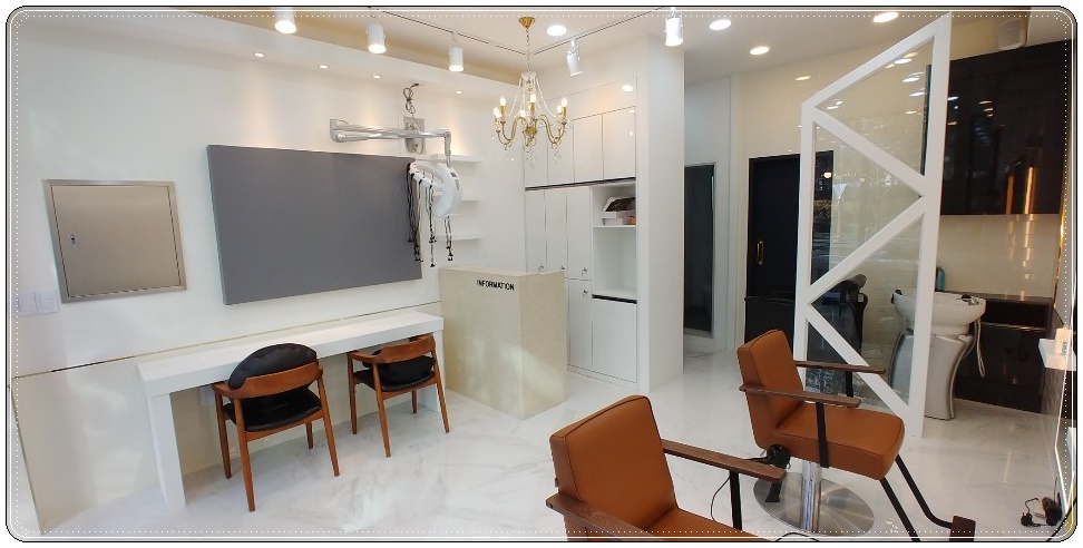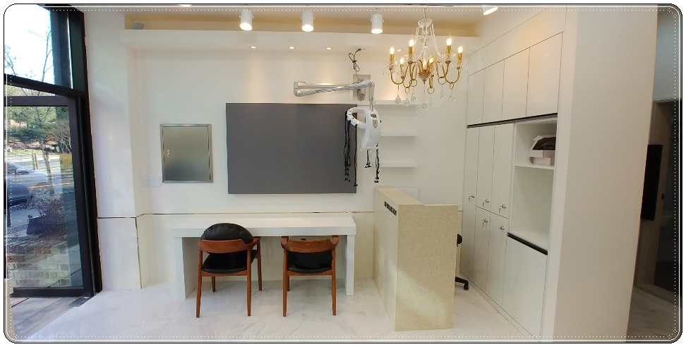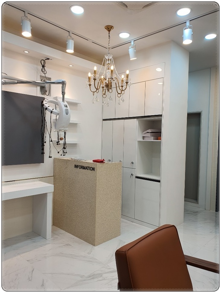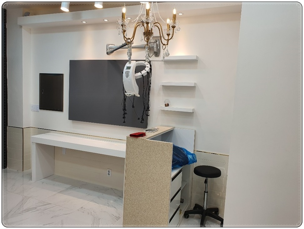 카운터 앞쪽 공간에 미용기구를 설치하여 이쪽에서도 다른 시술을 받을 수 있도록 공간을 마련해 주었습니다. 작은 소형 평수의 매장이다 보니 공간을 보다 효율적으로 사용할 수 있도록 디테일한 부분까지 신경 써서 진행하였습니다.