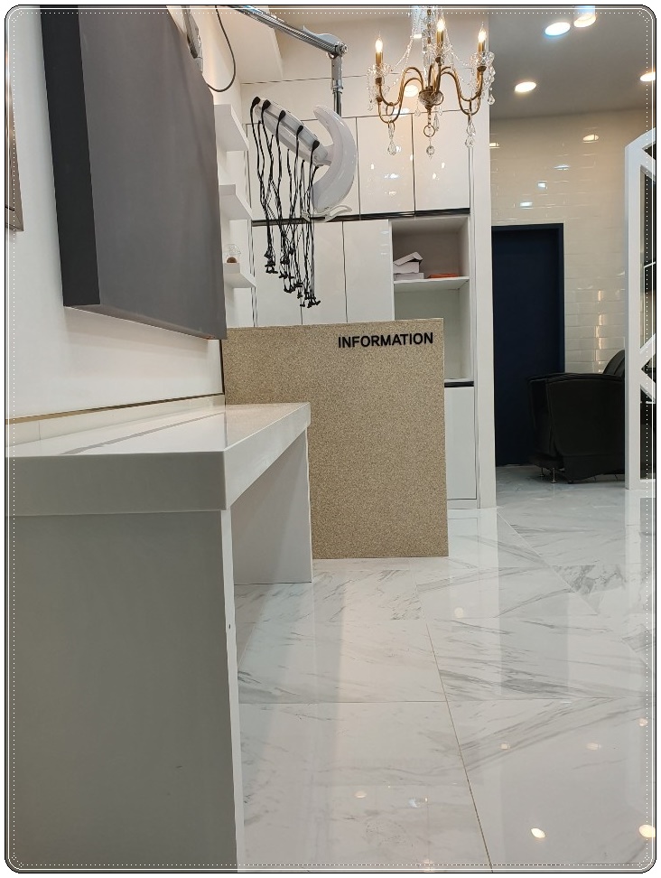 카운터 앞쪽 공간의 벽면 부분도 시술 공간 벽면과 동일하게 아래쪽에는 밝은 우드 컬러 타일을 넣고 골드 프레임을 더하여 포인트를 주었습니다.