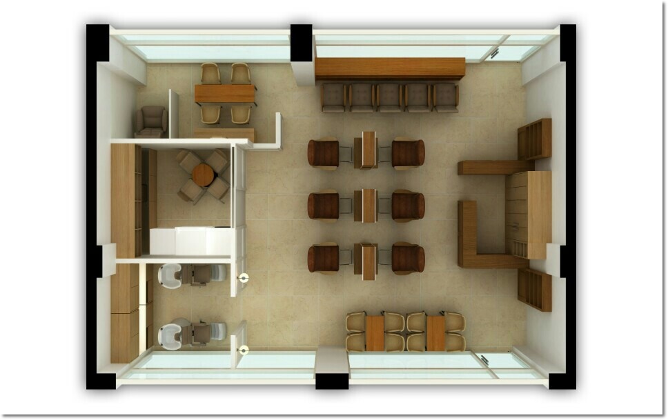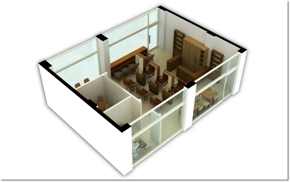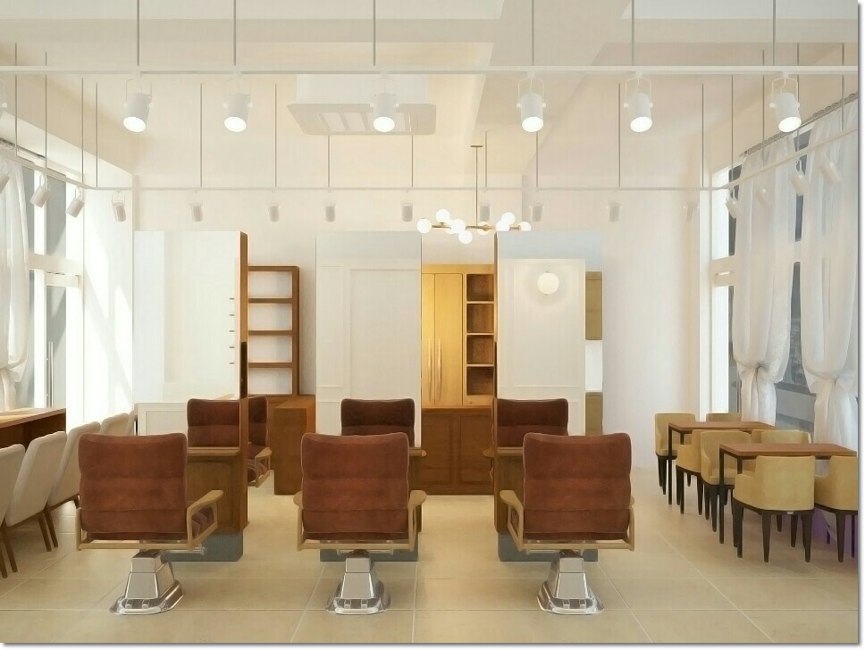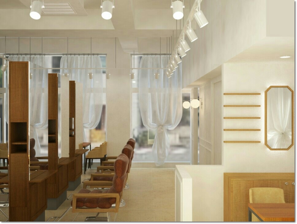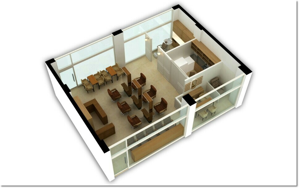 미장원 작업 공간의 내부 모습입니다. 3D 도안에서 보셨듯이 정돈된 분위기의 색깔의 조화가 작업자와 작업을 받는 고객의 마음을 한번에 편안하게 만들고 있습니다. 작업에 이용이 되는 거울 또한 색을 이용해서 보다 더 눈에 띄게 구성하였습니다. 이는 헤어 작업을 하는 작업자도 작업을 하는데 있어서 편안하게 할 수 있도록 도와주고 있으며 고객도 본인의 자리를 잘 찾아갈 수 있도록 시선 분산을 막은 것입니다.