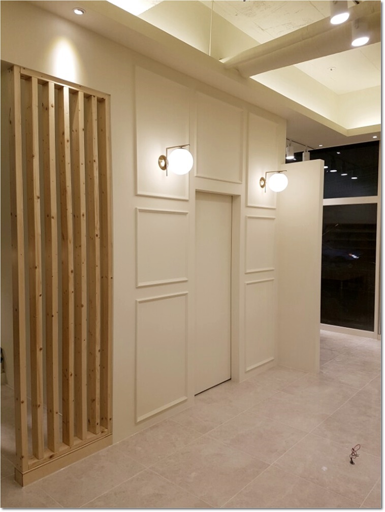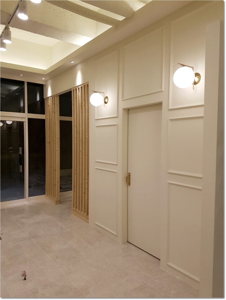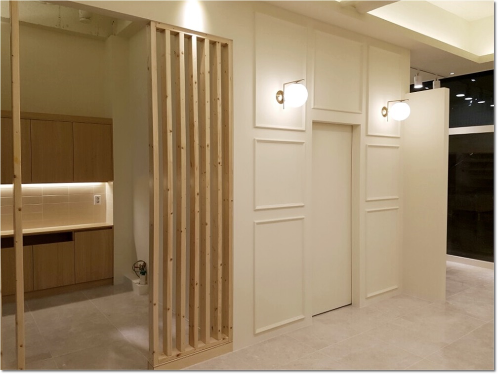 미장원 내부 모습은 전체적으로 우아한 분위기가 조성된 것을 보실 수 있으실 것입니다. 이는 웨인스코팅의 몰딩 기법을 사용하여 미장원 내부가 마치 유럽에 온 듯한 느낌을 받을 수 있도록 공간 배치를 한 것입니다. 이전까지는 내부 온열의 필요성으로 쓰였던 몰딩 기법이 이제는 좁은 미장원을 조금 더 우아하게 만들 수 있도록 디자인 구성을 도와주었습니다.