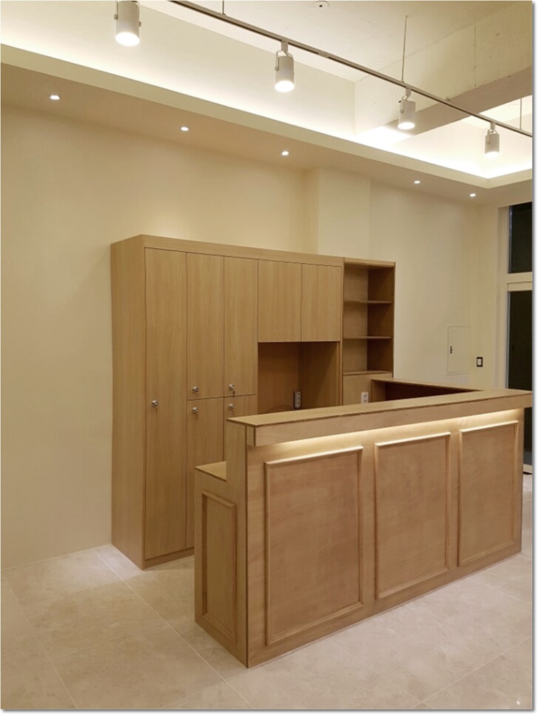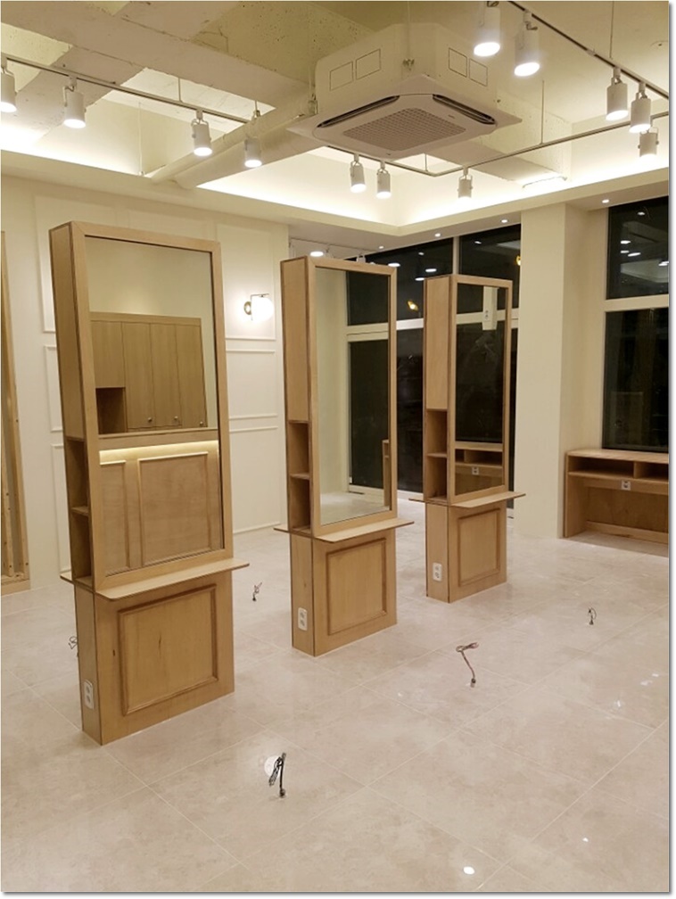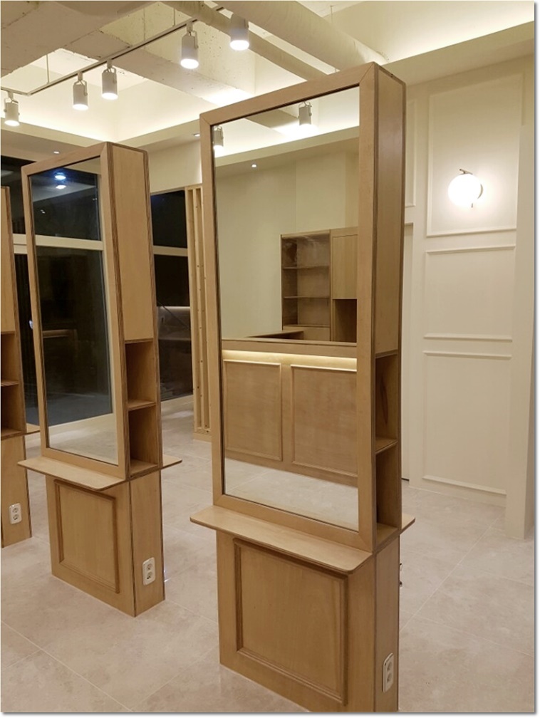 미장원의 안내데스크 모습입니다. 안내데스크는 출입문을 통해서 들어온 고객이 가장 먼저 발견하고 찾아가야 하는 곳입니다. 그렇기에 눈에 당연하게 띄어야만 하며 공간의 통일성을 생각하다가 이런 부분을 놓치게 된다면 샵을 이용하는 고객에게 불편함을 선사할 수가 있습니다. 저희는 이런 부분의 가구 인테리어를 기존의 베이지톤의 색보다는 한층 더 진한 색을 이용하여 인테리어 디자인 해보았습니다.