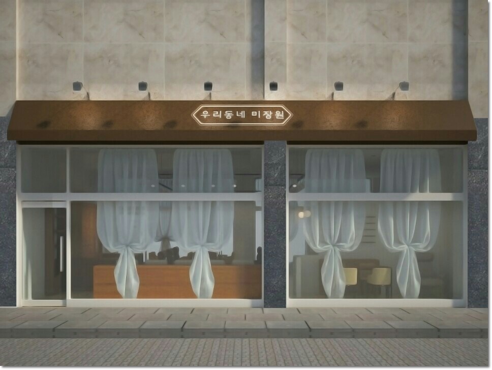 미장원의 외부 전경 모습입니다. 유리 인테리어를 사용해서 공간의 개방성을 강조해 보았으며 유리 외벽의 윗 부분에는 기업의 로고를 달아서 분위기를 살려보았습니다. 기업의 로고 또한 갈색 바탕의 금색의 소재를 사용하여서 디자인해보았습니다. 갈색톤의 색감은 미장원 내부의 분위기와의 통일성을 느끼게 하기 위해서 넣어 보았으며 금색 소재는 고객이 로고를 조금 더 눈여겨 볼 수 있도록 구성해보았습니다.