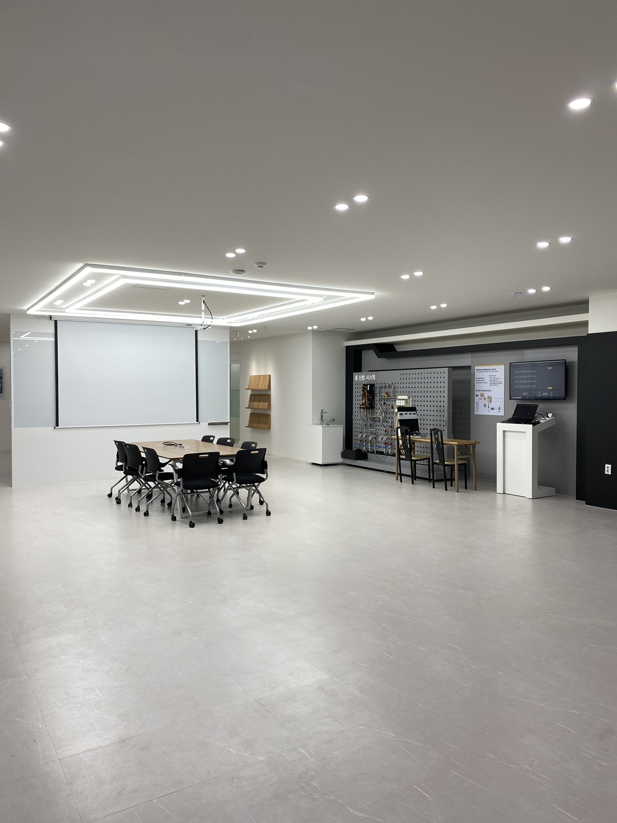 천장의 조명은 직선적인 LED 라인 조명을 설치하여 세련되고 모던한 분위기를 강조했으며, 공간 전체의 균형을 잡아주는 역할을 합니다. 이러한 오픈형 공간은 단순히 업무만을 위한 공간이 아니라, 전시와 커뮤니케이션을 동시에 이끌어낼 수 있는 유연한 공간으로 활용될 수 있습니다.