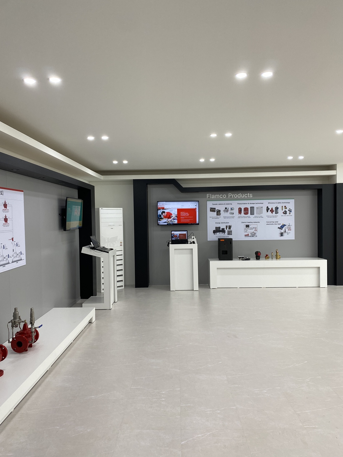 벽면 전체를 단순한 마감으로 두지 않고 제품과 기술 자료를 전시할 수 있도록 모듈형 디스플레이 존을 구성했습니다.