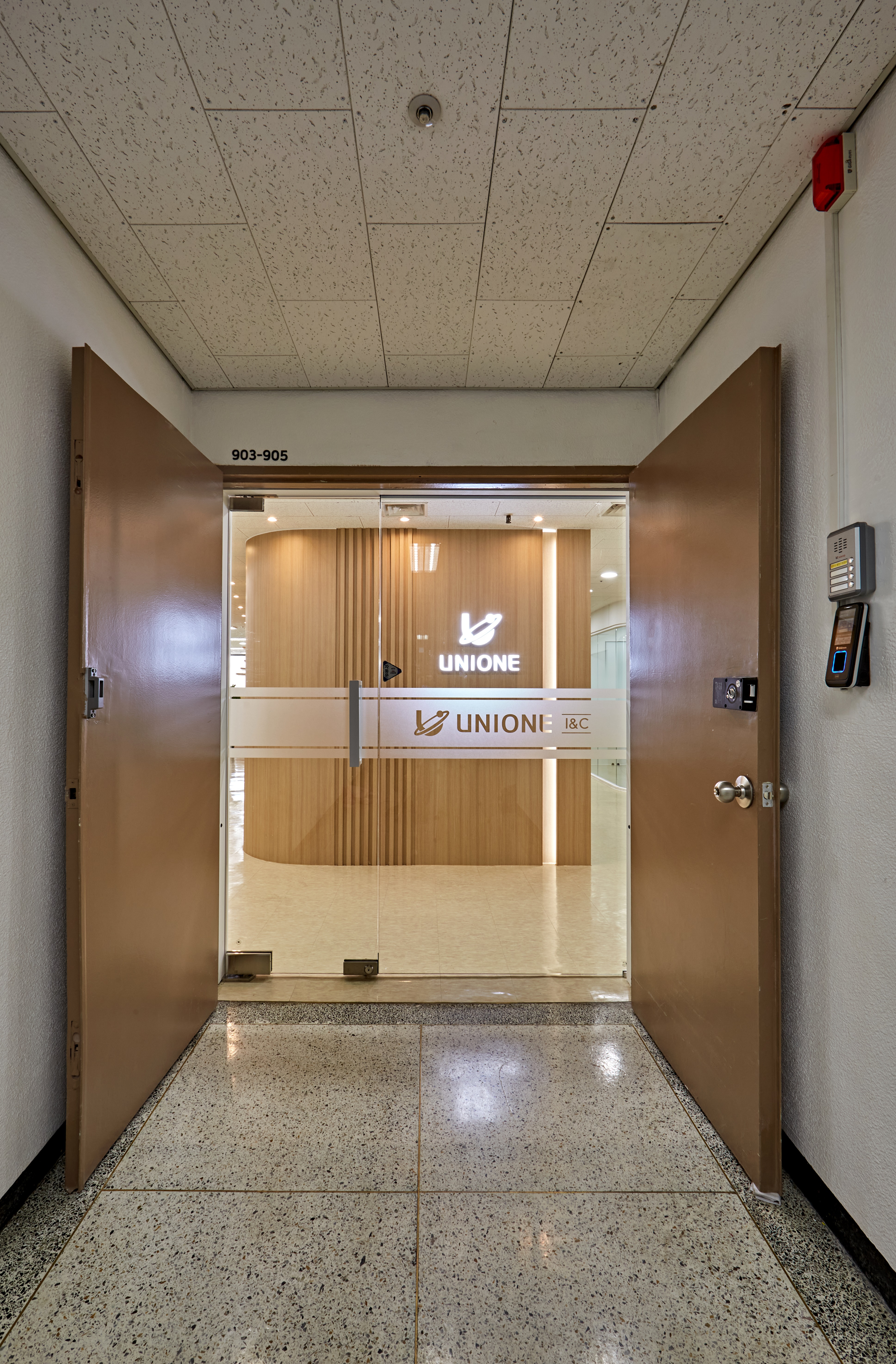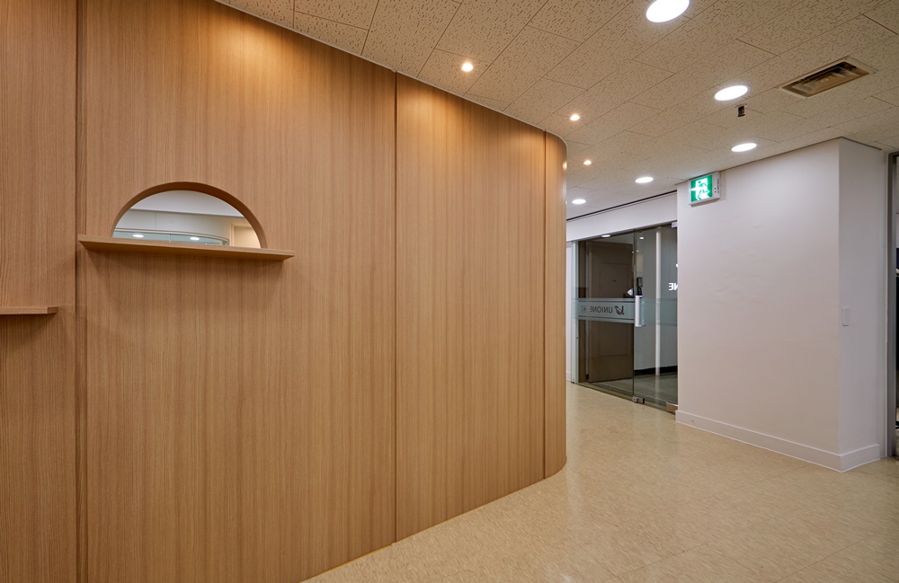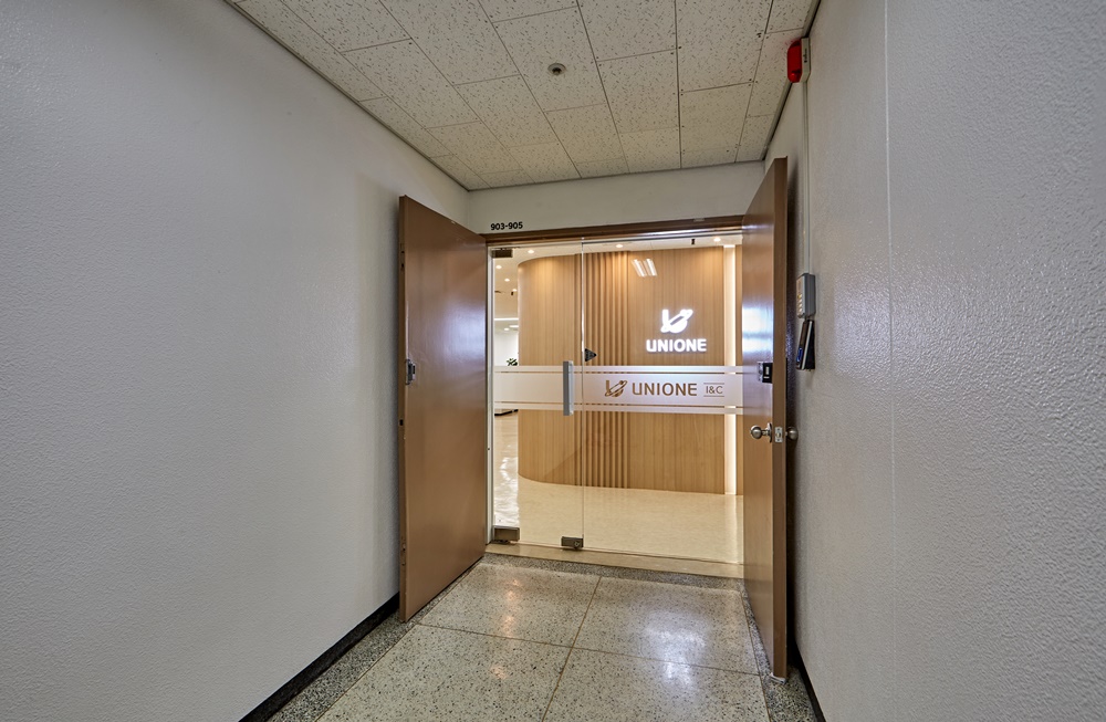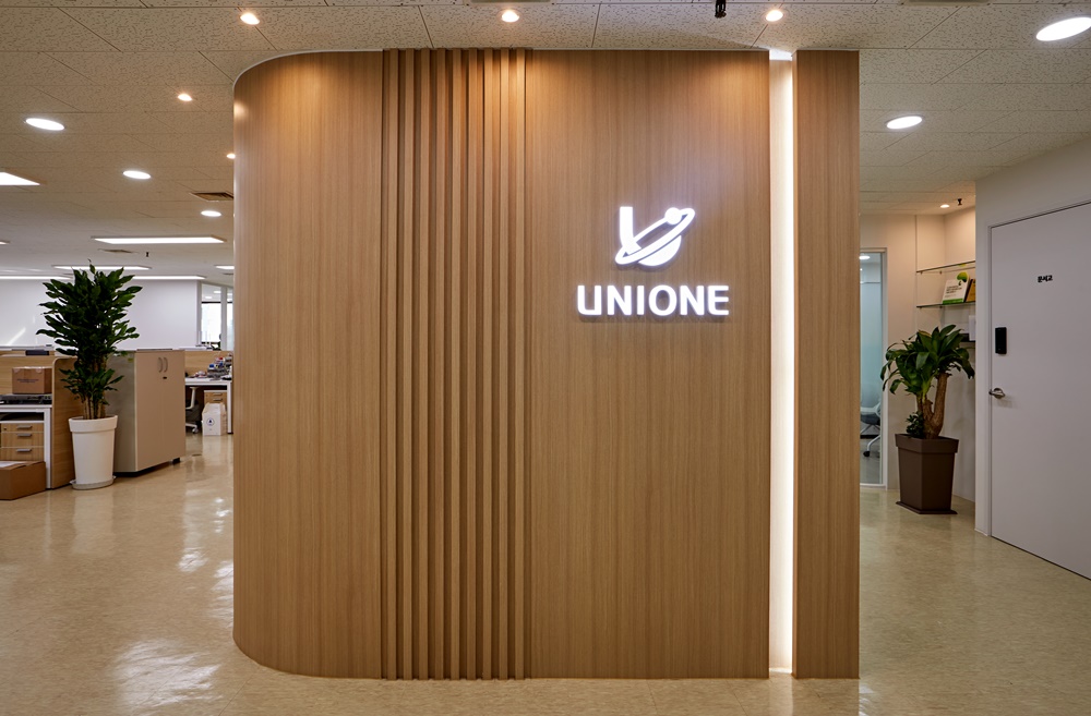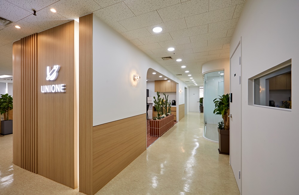 먼저, 곡선 원목 벽면과 조명으로 강조된 UNIONE 로고는 방문객에게 깊은 인상을 남기며 브랜드 신뢰도를 높이는 디자인 요소인데요.