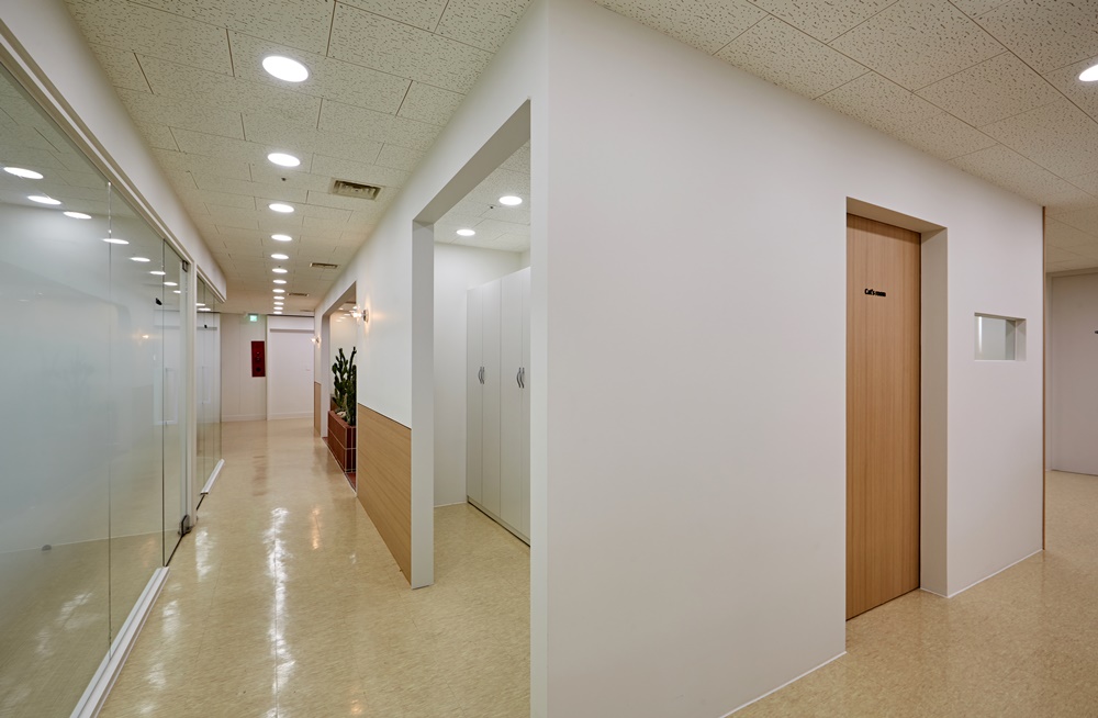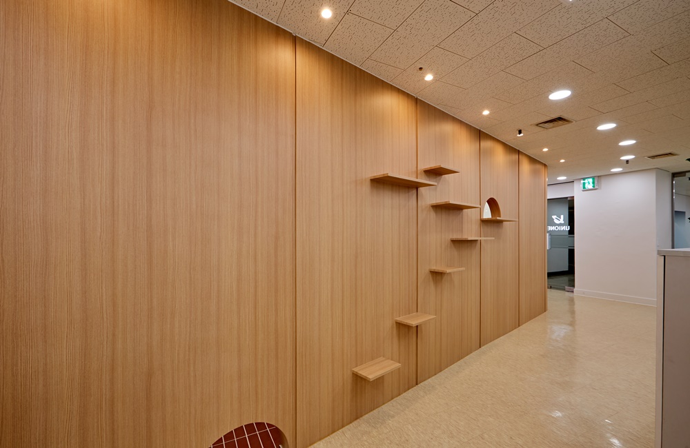 직원과 반려묘가 서로 자연스럽게 공존할 수 있도록 조용한 위치, 따뜻한 조도, 은은한 톤의 마감재도 함께 적용했어요.