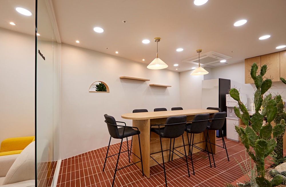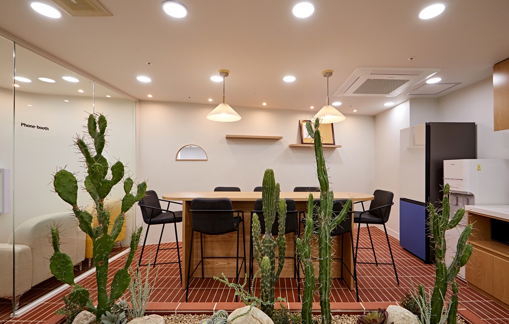 특히 선인장과 다육식물들이 공간 중앙에 조성되어 자연의 싱그러움과 활력을 더해주어 업무에 지친 직원들이 잠시 힐링할 수 있는 환경으로 만들었어요.