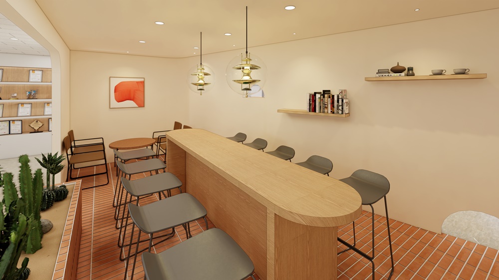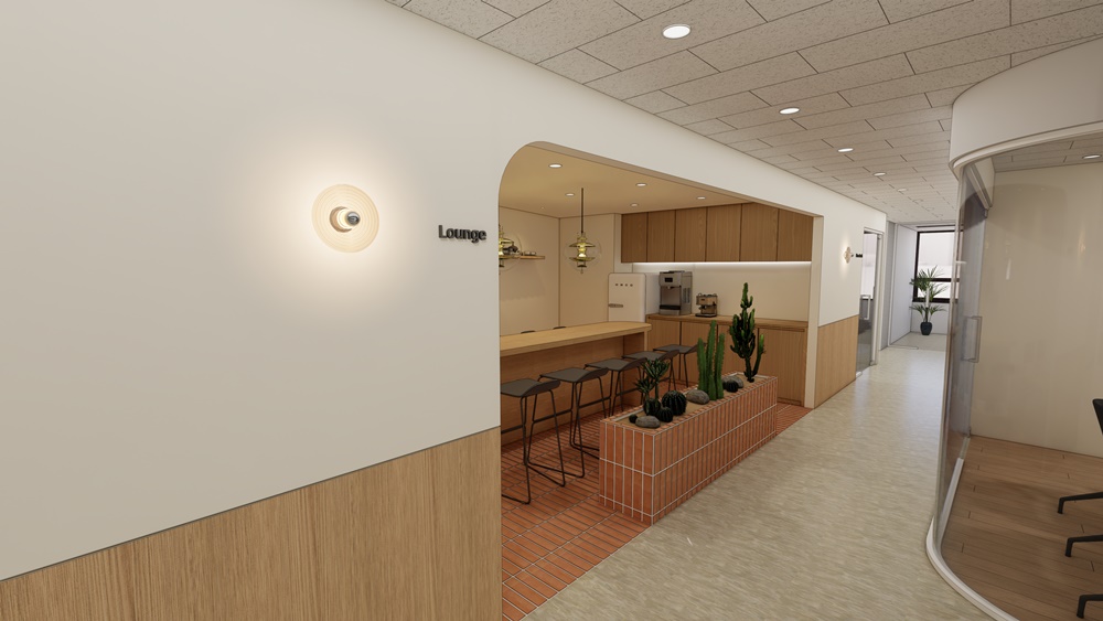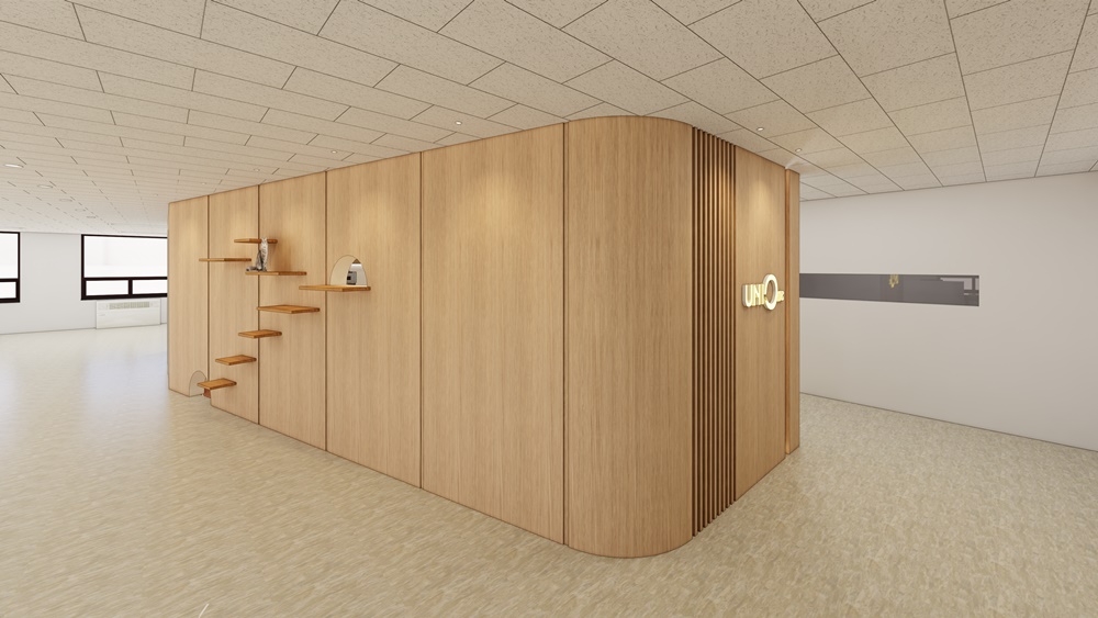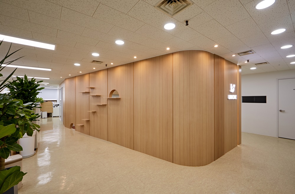 고객사가 추구하는 브랜드 분위기, 직원 복지, 반려묘의 라이프스타일까지 고려한 공간 구성이 필요했기 때문에 곡선미를 살린 원목 벽면 디자인, 친환경 베이지·화이트 톤 기반의 직원 친화적 공간, 반려묘 캣타워·휴식 공간의 디테일한 시뮬레이션이라는 세 가지 키워드를 중심으로 디자인을 진행했어요.