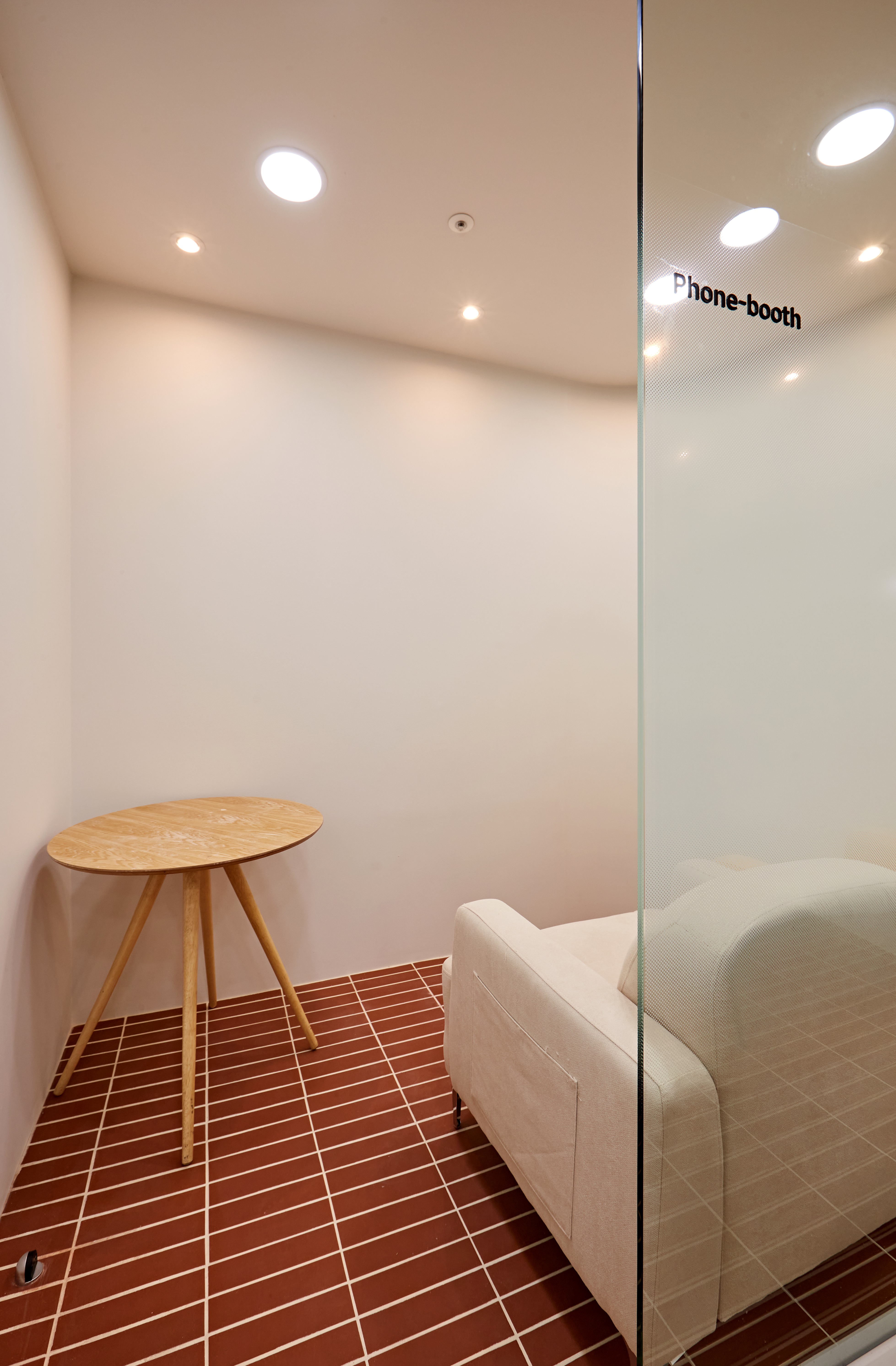 또한 유리 파티션에는 ‘Phone-booth’라는 글자가 세련되게 붙어 있어 외부와 공간을 분리하면서도 투명하게 보이도록 설계해 답답함을 최소화했어요.