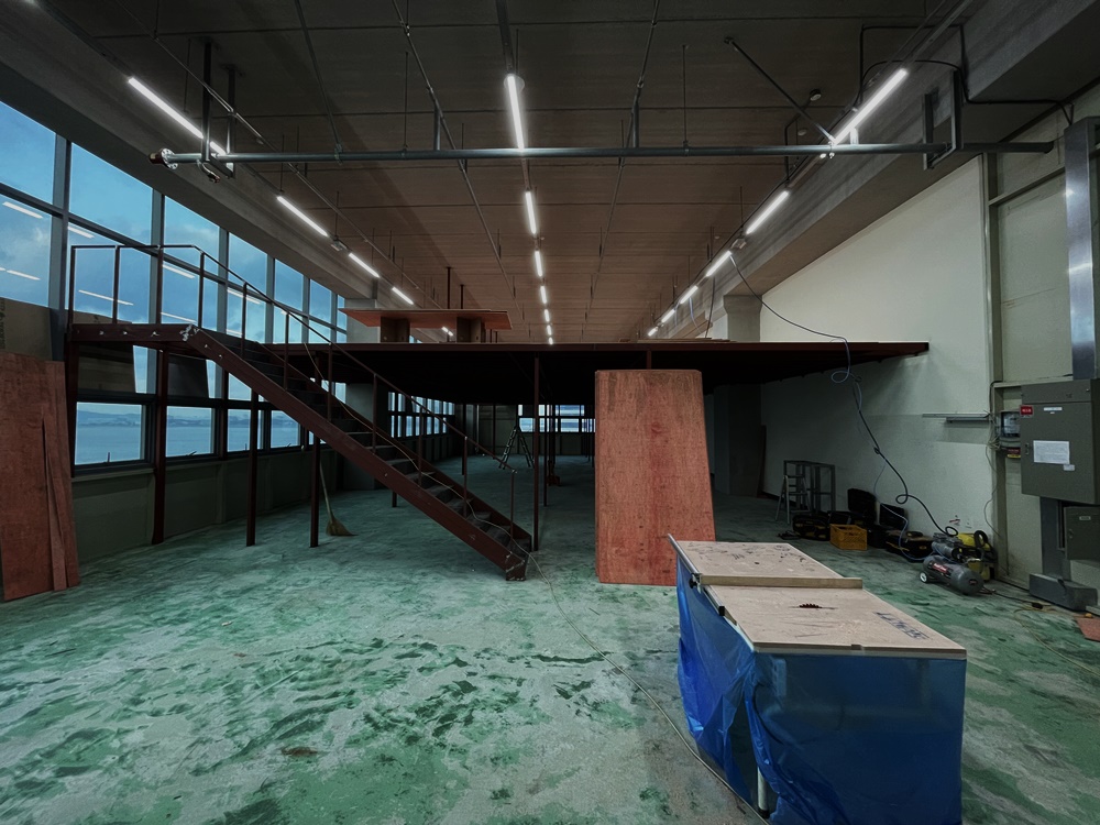 직선으로 뻗어나가는 조명 라인은 트렌디한 사무실 분위기를 극대화하며, 콘크리트 블록 벽면의 질감과 에폭시 바닥의 광택을 더욱 돋보이게 만들어줍니다.