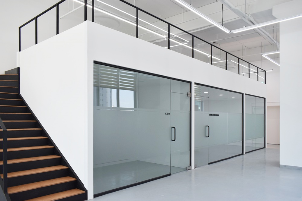 하부 공간에는 투명 유리 파티션을 설치해 공간의 개방감을 유지하면서 업무 구역을 효율적으로 나눌 수 있도록 설계했어요.