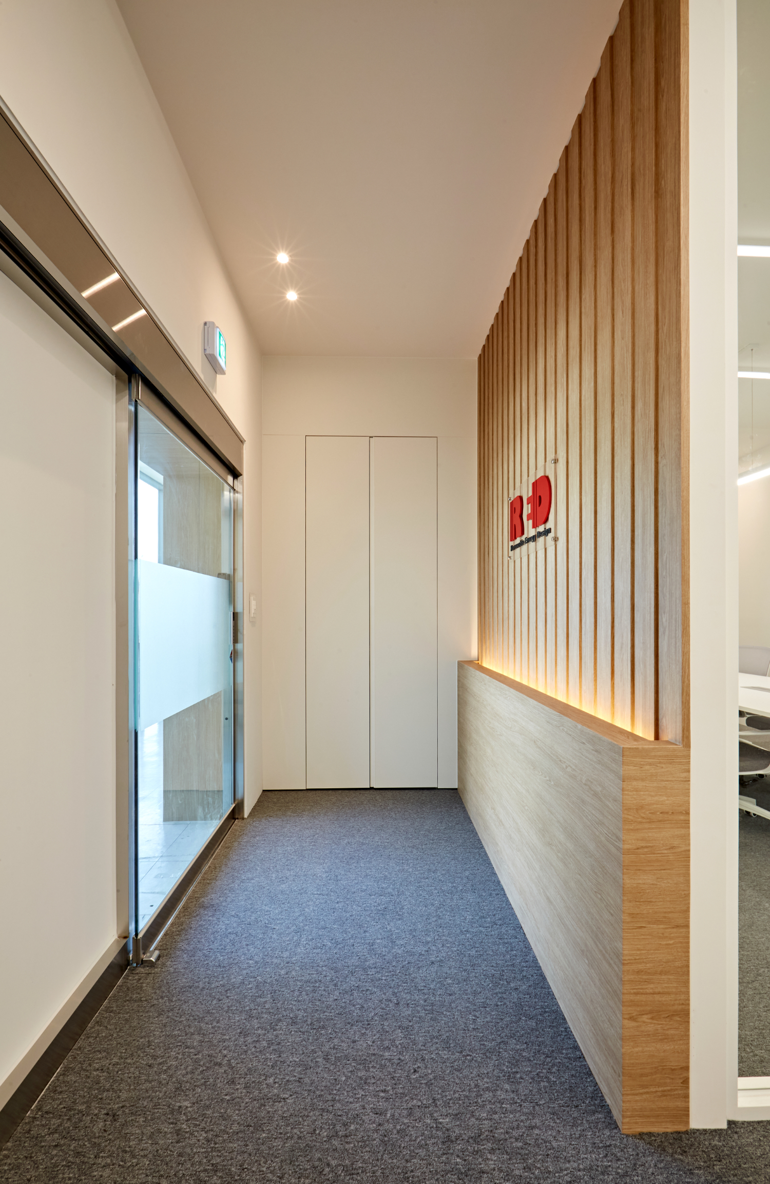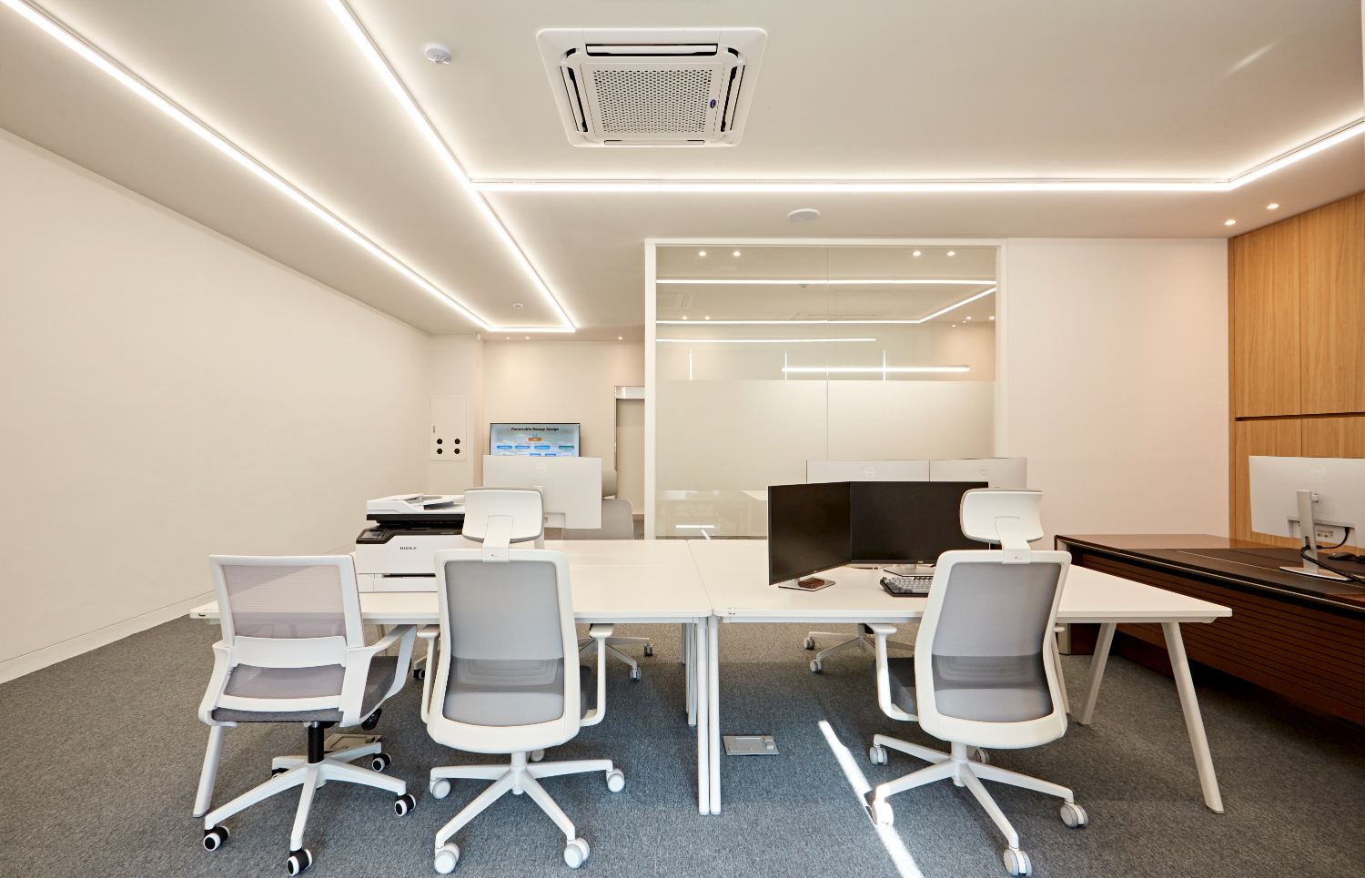 아트월을 따라 들어오면 회의실과 업무 공간이 구성되어있습니다. 입구부터 내부 공간까지 천장에 라인등이 설치되어 있어 전체적으로 통일감이 느껴집니다.