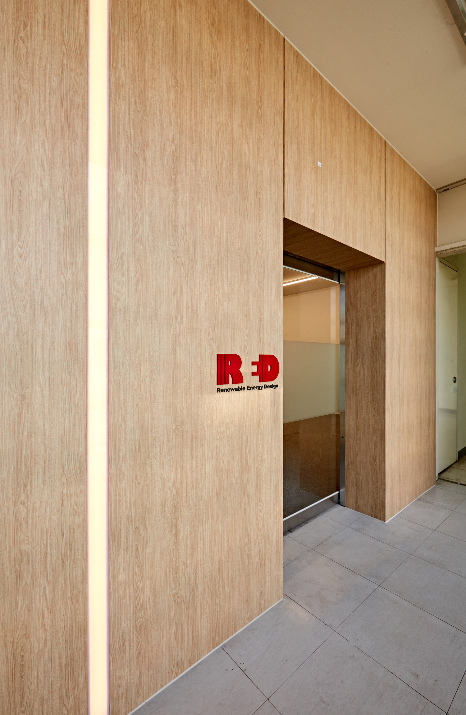 먼저 깔끔한 우드 인테리어가 돋보이는 외부 파사드입니다. 내추럴한 디자인으로 편안한 분위기를 연출했습니다. 파사드 좌측에는 매립형 라인 조명과 레드 컬러의 기업 로고 사인물로 포인트를 주었습니다.