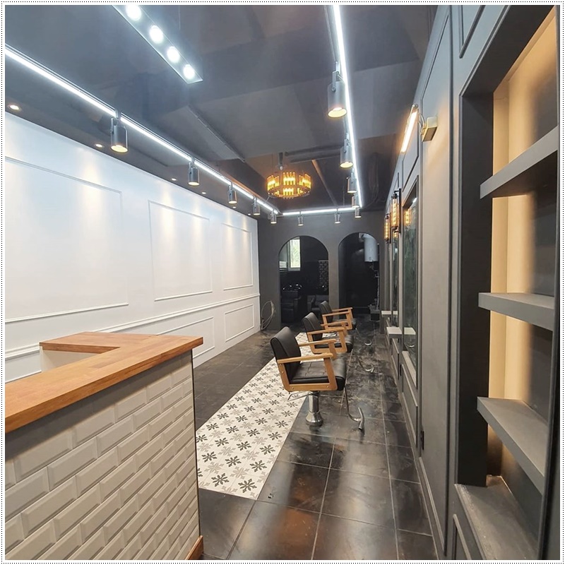 샴푸대 실에서 작업공간을 바라보면 이런 인테리어가 보일 수 있습니다. 작은 미용실임에도 불구하고 천장부터 입구까지 일자로 이어지는 게 효율적인 공간배치로 넢게 인테리어를 한 모습이 보입니다. 소형 실내 인테리어 같은 경우는 위에서 설명 드렸듯이 도안을 통해서 실내를 미리 이해하고 정확한 구성을 한다면 한층 더 멋진 인테리어가 가능합니다.