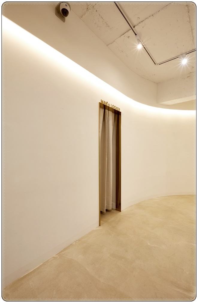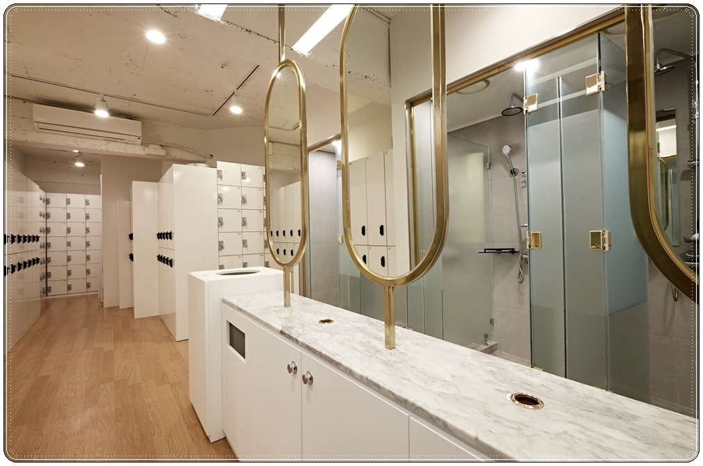 헬스장의 수납장의 모습입니다. 운동을 마치고 몸과 마음이 지친 고객들은 본인의 심신을 정리할 수 있고 옷을 갈아입을 수 있는 정돈된 분위기를 요구하고는 합니다. 저희는 이런 부분을 운동을 마치고 마무리를 할 수 있는 수납 공간에서 분위기 조성을 해보았습니다. 화이트톤을 이용해서 깔끔함을 강조해보았고 고객의 마음을 안정시키기 위한 우드톤의 바닥 소재를 이용하였습니다.