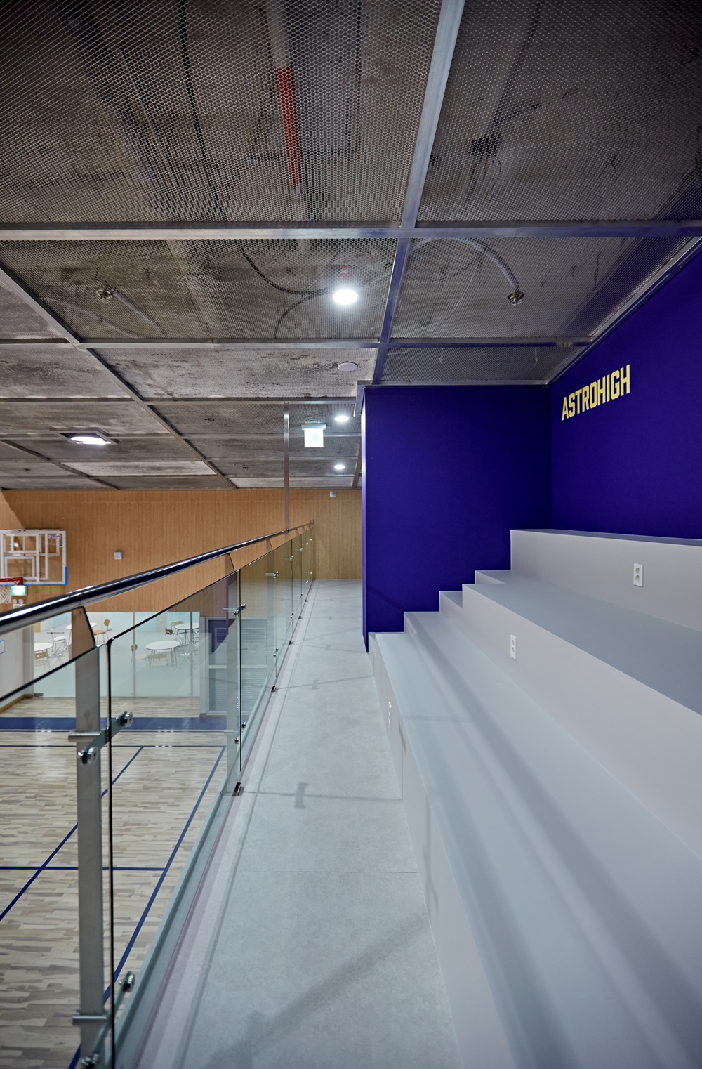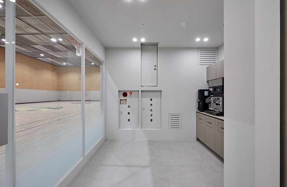 차가운 금속 프레임 사이로 쏟아지는 주황빛 농구 코트의 활기, 그리고 이를 평온하게 관조하는 사무실 사무공간의 만남은 마치 정교하게 설계된 한 편의 건축 영화를 보는 듯한 착각을 불러일으키죠.