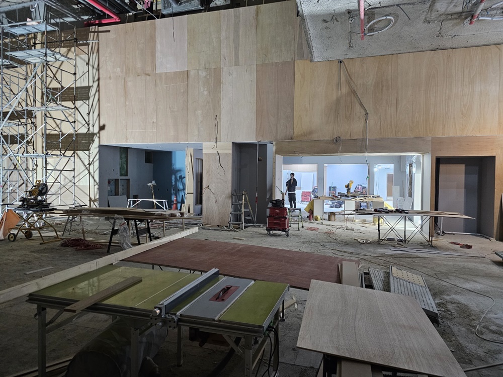 이어지는 목공 공정에서는 센터의 디자인 톤을 결정짓는 인포메이션 데스크와 벽면 아트월, 그리고 카페테리아의 맞춤형 수납 가구들이 현장에서 직접 제작되었답니다.