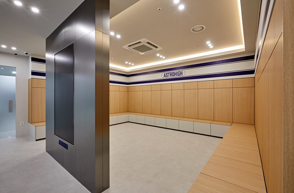 메탈 파티션 안쪽으로 진입하면 결이 살아있는 고급스러운 우드 텍스처로 가득 찬, 안락한 로커 공간이 펼쳐집니다.