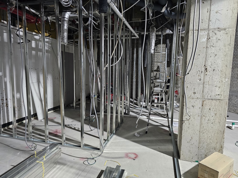 넓은 층고를 가진 현장 특성상 가벽의 수직과 수평을 맞추는 것이 무엇보다 중요했기에, 레이저 레벨기를 활용한 오차 없는 수직도 측정이 선행되었답니다.