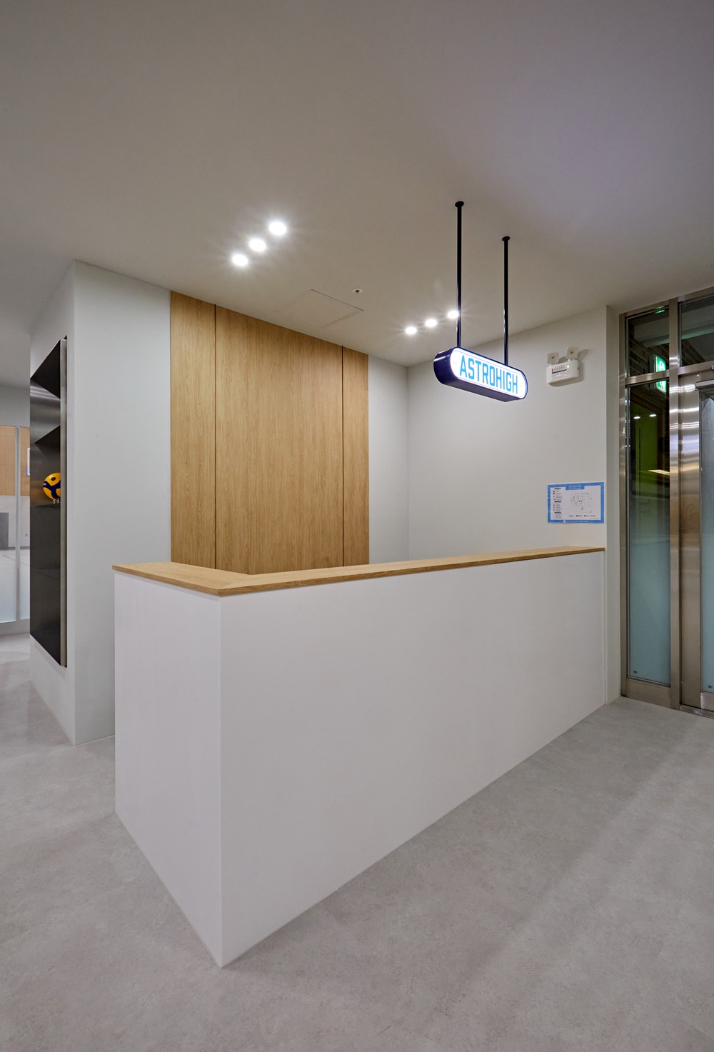 화이트 톤의 깔끔한 인포메이션 데스크는 우드 아트월과 만나 따뜻한 첫인상을 완성하고, 그 상단에는 입체적인 로고 사인이 은은한 빛을 내뿜으며 브랜드의 정체성을 강조하죠.