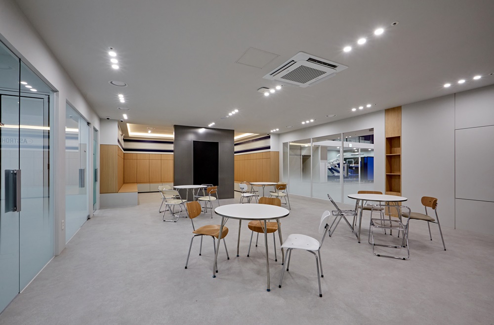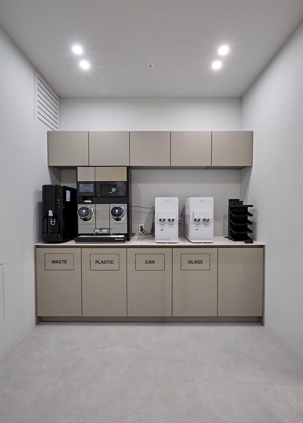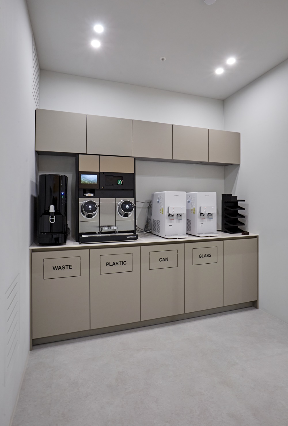 휴게 시설인 카페테리아와 탕비 구역 또한 군더더기 없는 빌트인 설계의 진수를 보여줍니다.