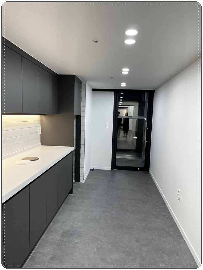 발코니 휴게공간으로 나가는 출입문과 연계된 탕비실 공간입니다. 싱크대 하부장과 상부장을 설치해드렸고 냉장고장을 짜서 깔끔한 정리가 될 수 있도록 했습니다. 춘천 하이테크타워 사무실인테리어를 계획 중이시거나 오늘 포스팅을 보시고 궁금한 점이 있으시다면 저희 916디자인으로 문의해주세요. 고객님이 원하시는 1:1 맞춤인테리어를 합리적인 견적으로 퀄리티 높게 진행해드리겠습니다.